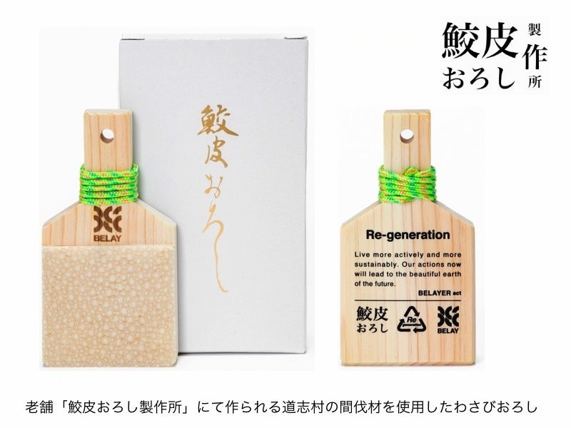 ◯鮫皮わさびおろし 【数量限定商品】 / 岐阜の老舗工房「鮫皮おろし製作所」製作のBELAYオリジナルのわさびおろしです。希少な本鮫皮と道志村の間伐材(檜)を使用し、持ち運びに便利な小型サイズ。個人使用やキャンプなど野外でも本わさびの美味しさをご堪能いただけます。