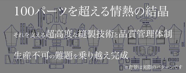 複雑なジグソーパズルのような商品のため、一般的な縫製工場様では生産することはできず、高度な品質管理と熟練の縫製技術、そして深いご理解が必須となります。