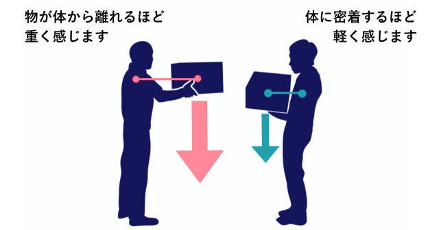 荷物と体の距離が近ければ近いほど軽く感じるという物理的法則があります。