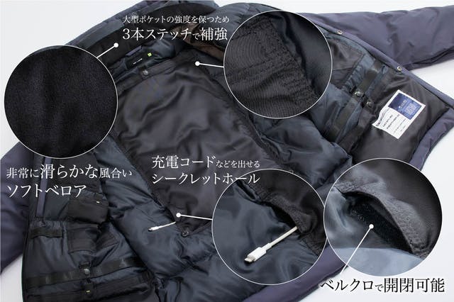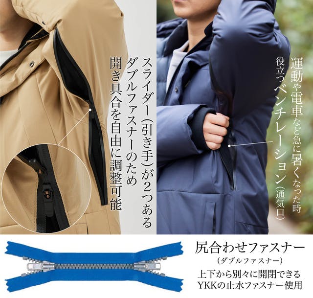 YKK止水ファスナー+前立て+持ち出しの『3重の鉄壁ガード』により、冷気をシャットアウトしております。