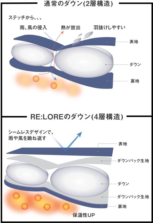 800FILL POWER(FP)・・・一般的に550FP以上が上質なダウンとされていますが、RE:LORE™はそのはるか上を行く800FPを採用しました。
