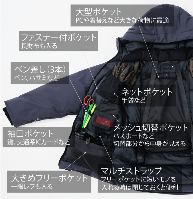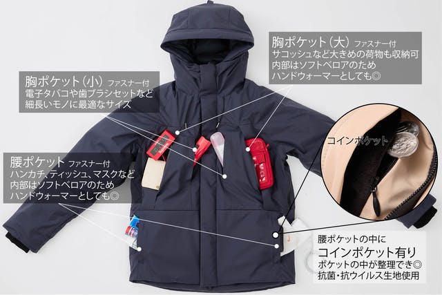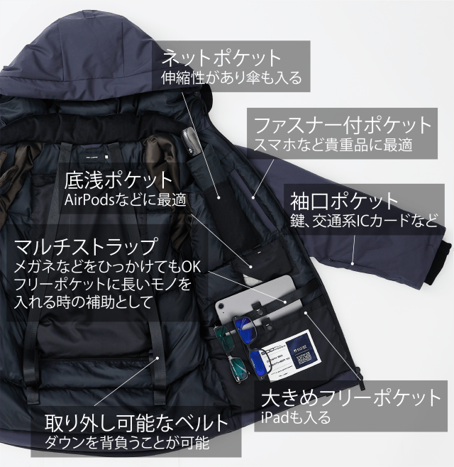 GENIUS(天才)の名に恥じないよう一切妥協することなくこだわり抜いたガジェット好き、ミニマリスト垂涎の『賢いダウンジャケット』です。
