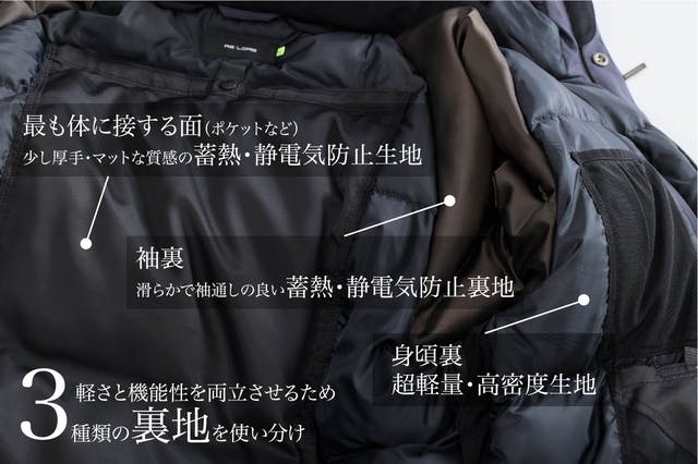 身頃裏(大部分)は超軽量・高密度生地を使用することで、全体的な軽さを確保し、袖裏には袖通しの良い滑らかな風合いの蓄熱・静電気防止裏地を採用しました。