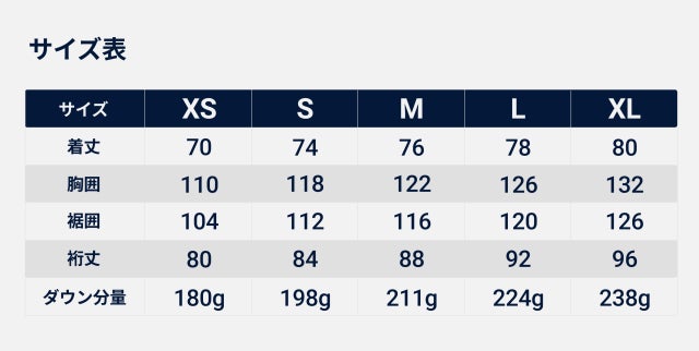 ※ダウンの封入量はサイズによって異なります。(手作業で詰めているため個体差が多少あります。)