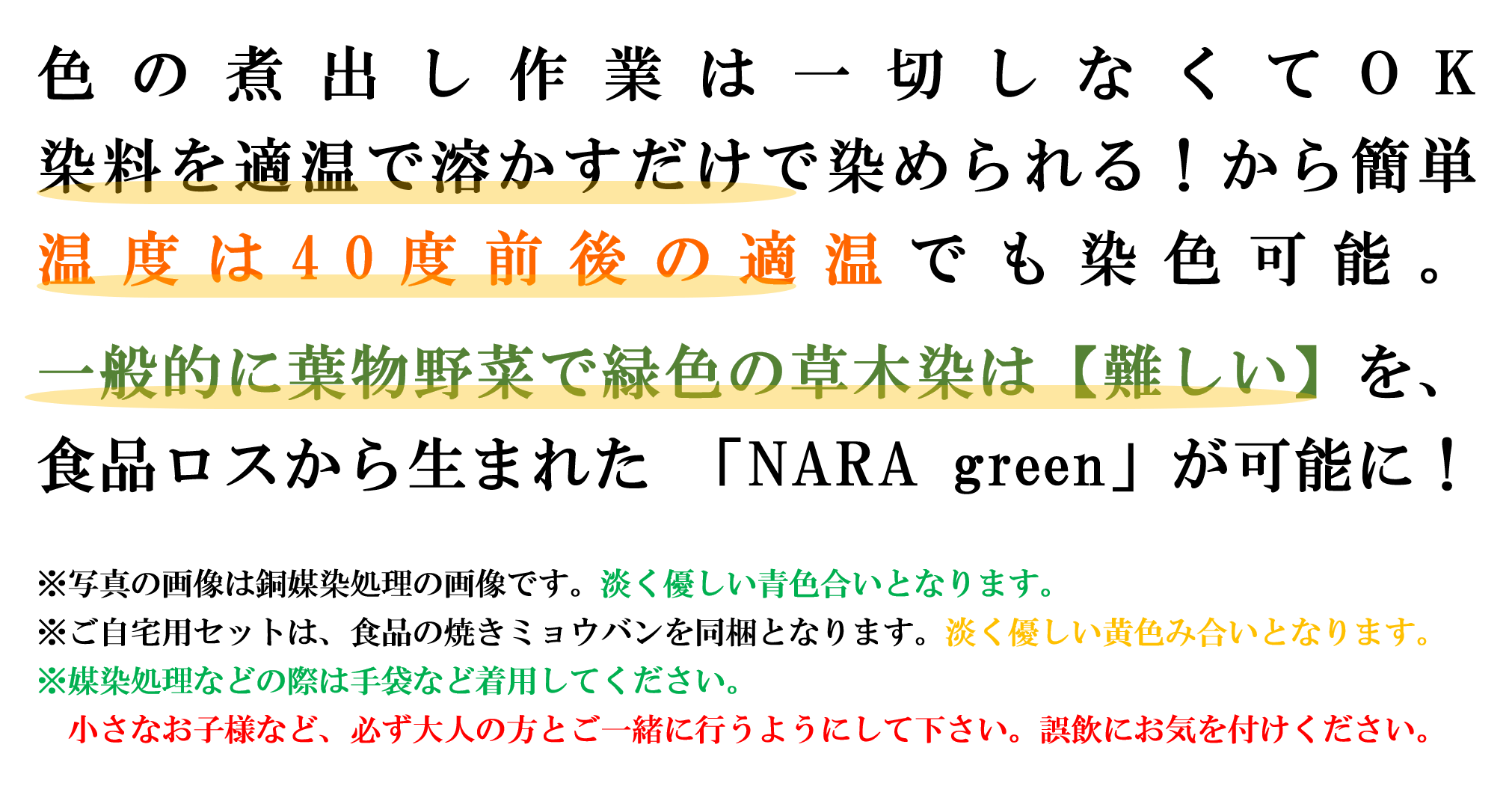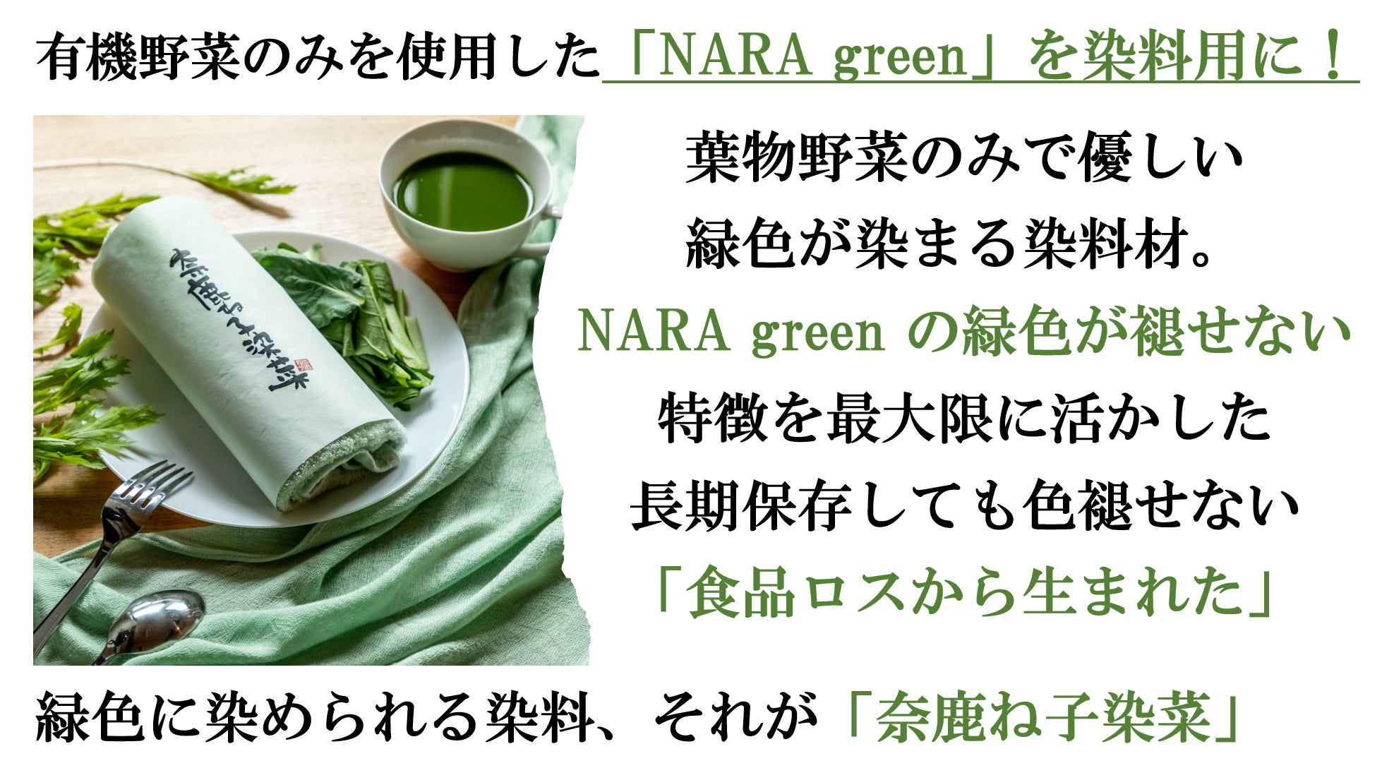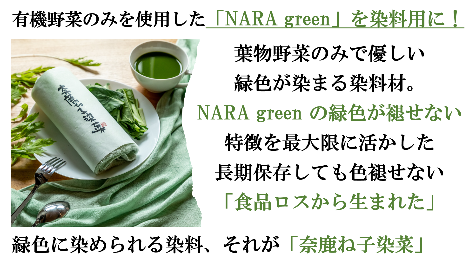 そんな安心安全なNARAgreenの特徴を最大限に活かした、葉物野菜で緑色染料を実現し【社会課題を楽しいに変える】未来を実現したい。