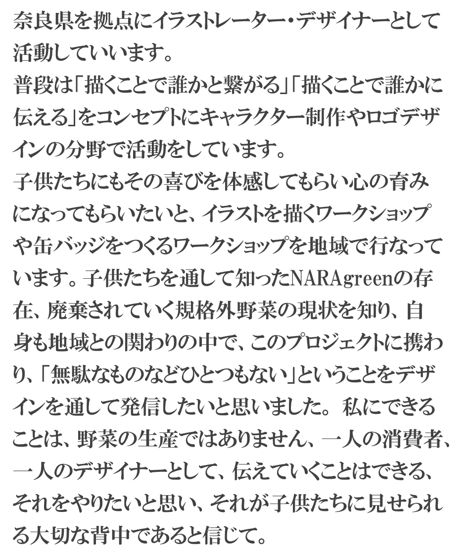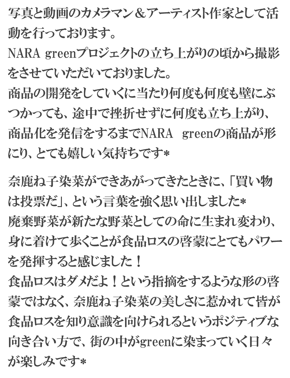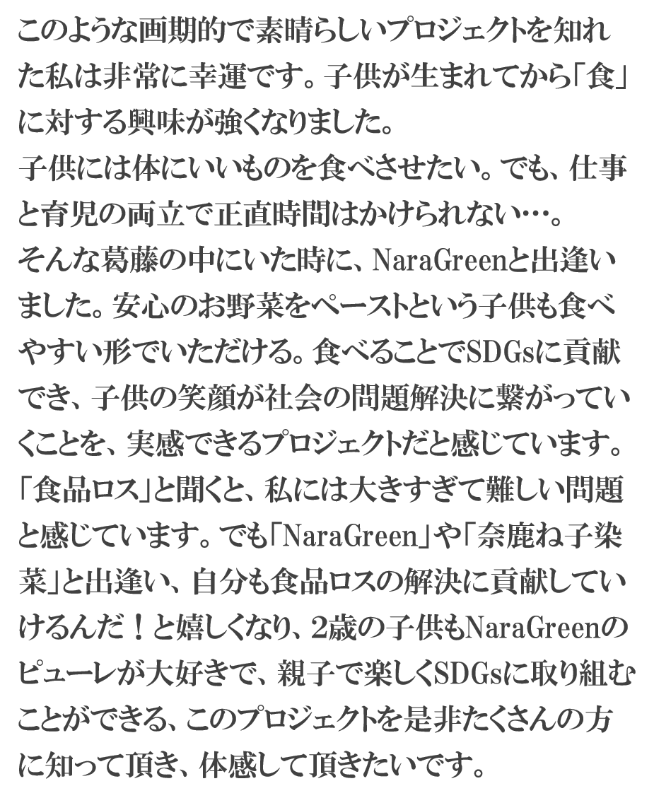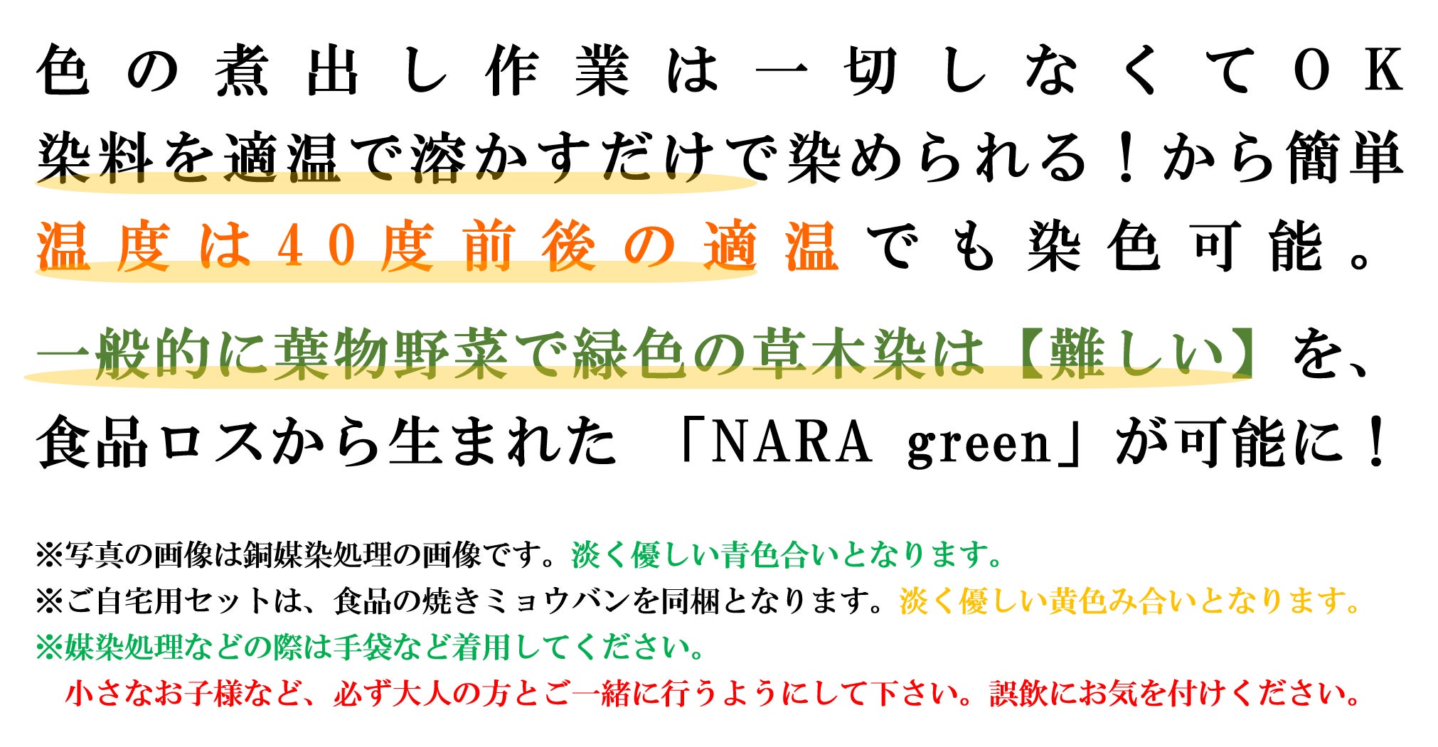 そんな安心安全なNARAgreenの特徴を最大限に活かした、葉物野菜で緑色染料を実現し【社会課題を楽しいに変える】未来を実現したい。