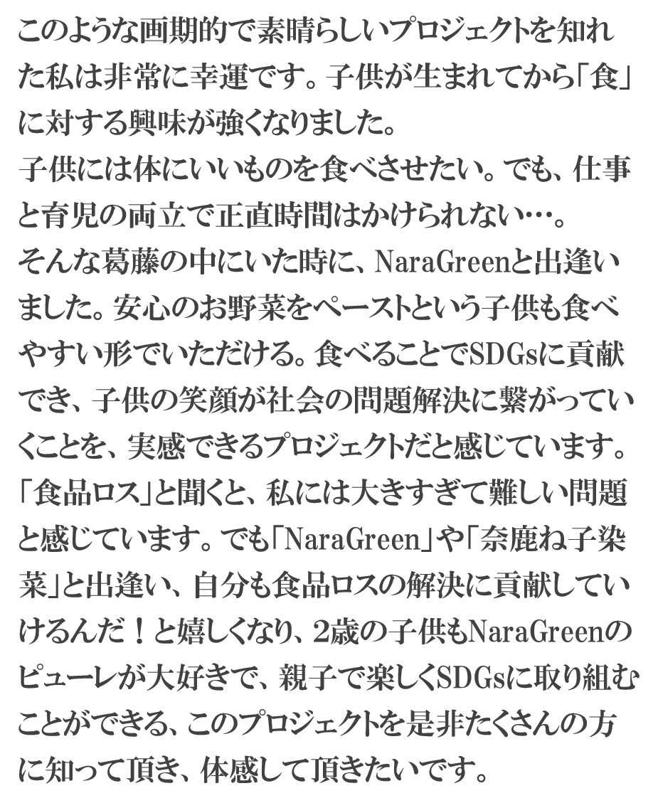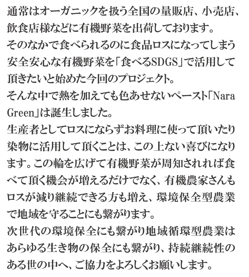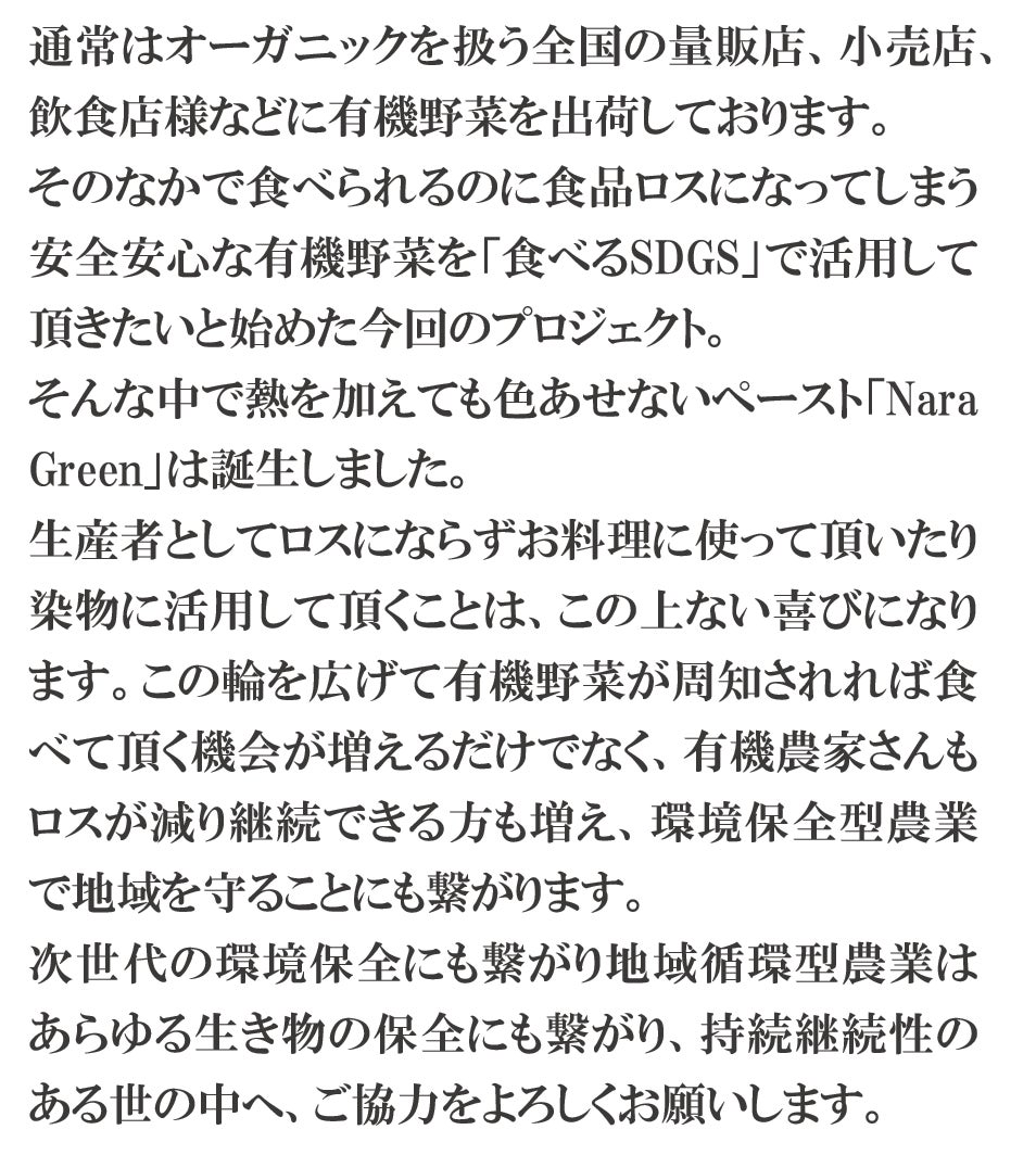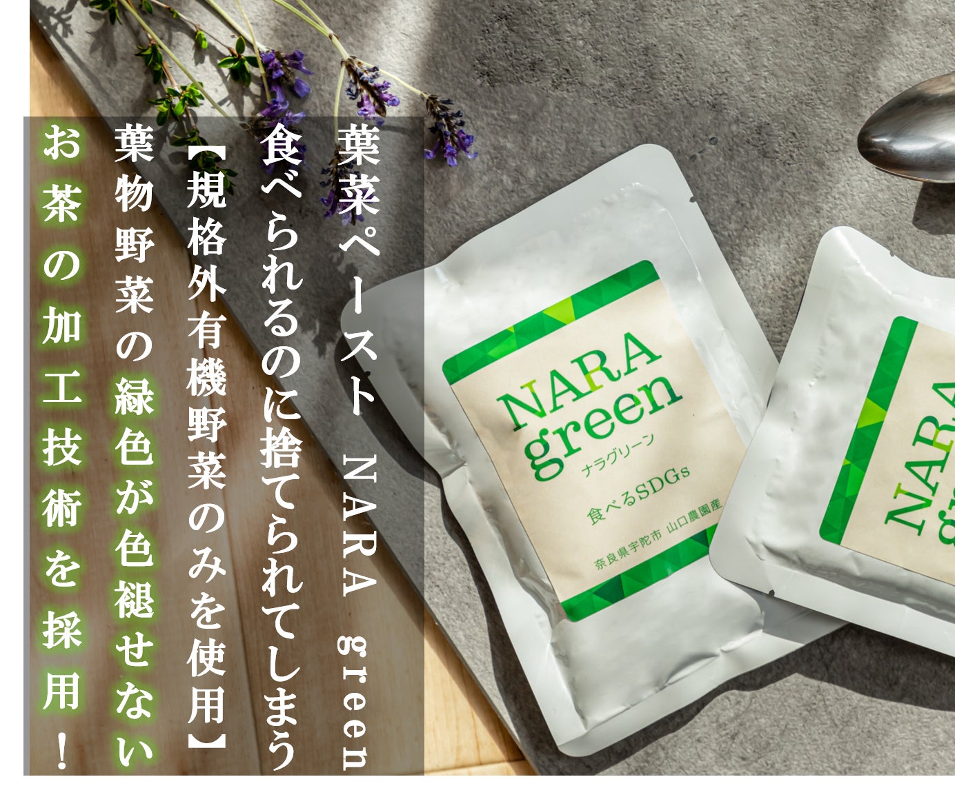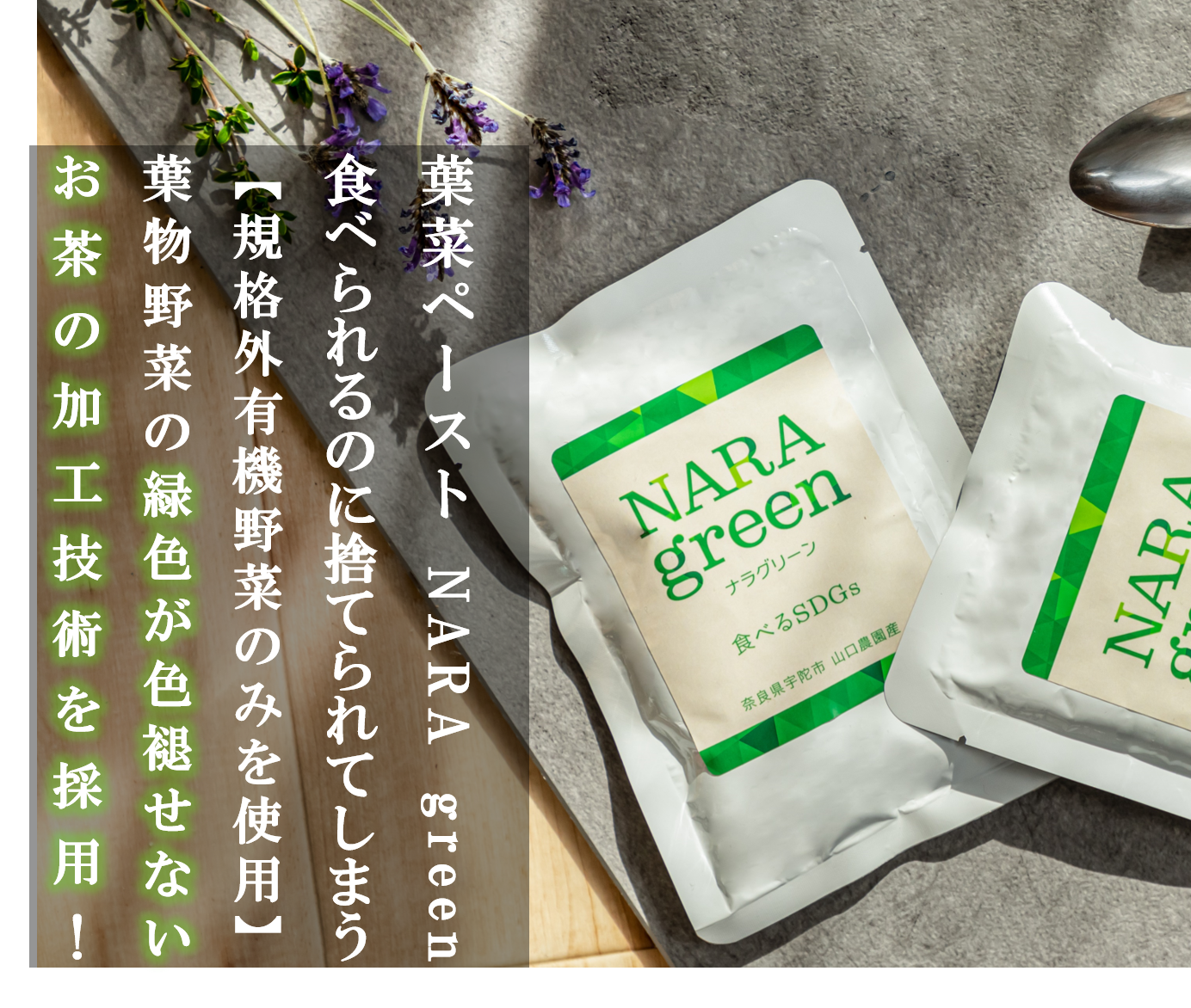 山口農園で育てられた有機野菜のみを使用し、環境に配慮した葉物野菜と、国内の食品ロス問題と 向き合い、“食べるSDGs”として“食品ロス野菜”を 社会資源へと有効活用するために生まれたのが、葉菜ペースト「NARAGreen」