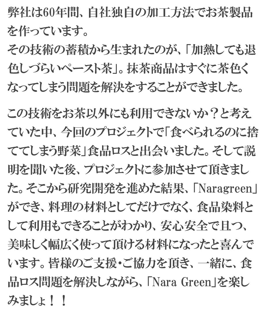 有機野菜のみを原材料にお茶の加工技術で色褪せない、規格外「有機野菜から生まれた、食べるSDGs NARA green」です。