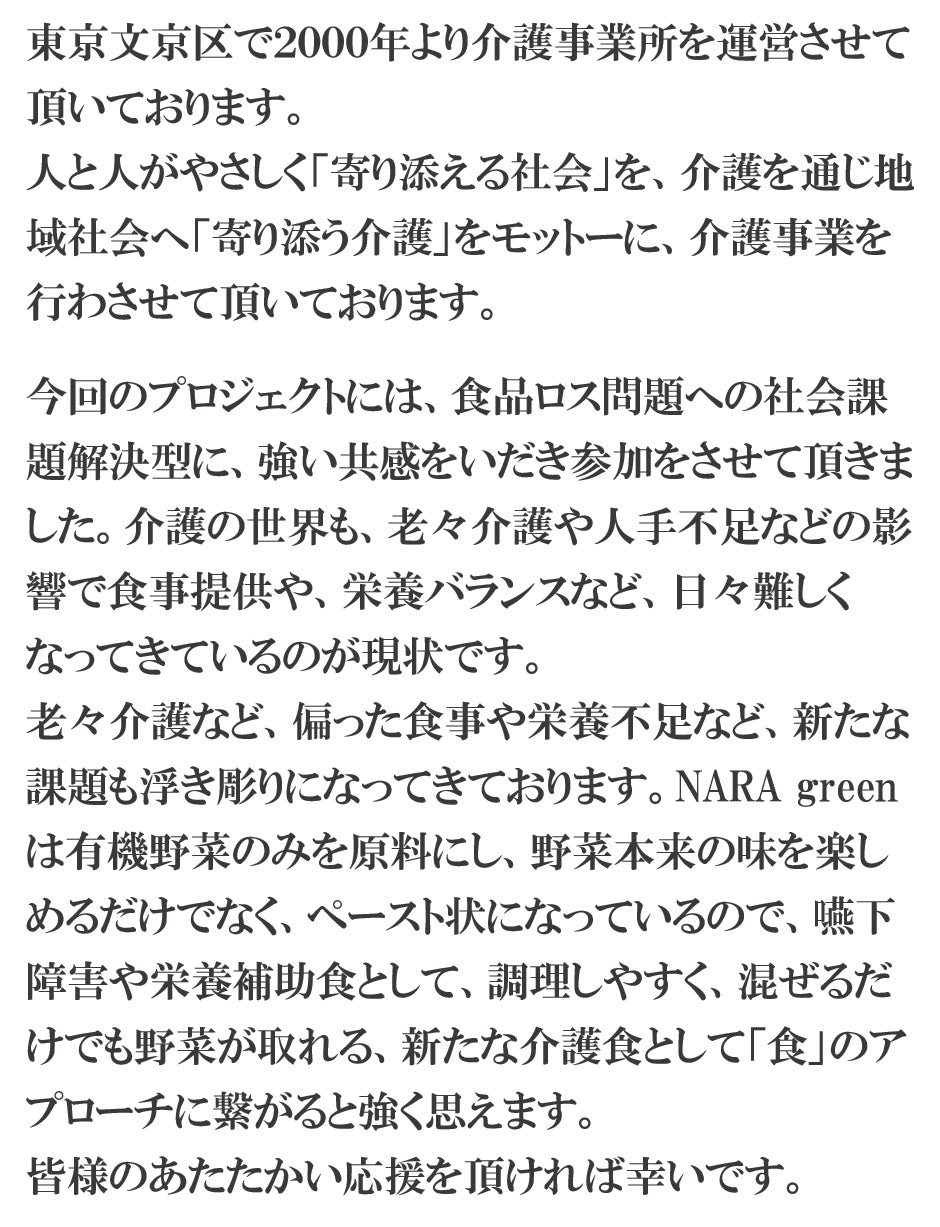 2022/11/17 09:16本日がついに最終日となりました。本当に沢山の方にご支援を頂けました事を、感謝申し上げます。山口農園さん、日本緑茶(加工)さんと一緒に1年の歳月を掛けて、失敗を繰り返しながらも諦めずに前に進めた結果、多くの方のご支援を頂ける結果に結びつきました事を、再度心より感謝致します。最終日となりましたが、ネクストゴールに少しでも近づける様に、皆様の最後のご声援を頂けると幸いです。最後まで何卒、宜しくお願い致します。返礼品(商品)の加工、製造依頼など8割ほど終了しております。タオルなどの最終校正チェックなどで完了する所まで進めさせて頂いております。※小冊子などの校正は別途にて、もう少し掛かる見込みでございます。皆様のご声援を頂き、奈良県の社会福祉協議会より一般社団法人Esの地域社会連携活動が認められ、次号掲載へのインタビューを受けさせて頂きました。また、奈良県にございます女子大とNARAgreenを使用したコラボレシピ開発もスタートさせて頂きました。沢山の方に【食品ロス問題】への取組に共感して頂き、子ども食堂支援や地域社会連携など、これからも一般社団法人Esは、持続可能な社会を目指して活動の歩みを進めさせて頂きます。最終日に長文となり誠に恐縮ではございますが、ご報告をさせて頂きます。 もっと見る