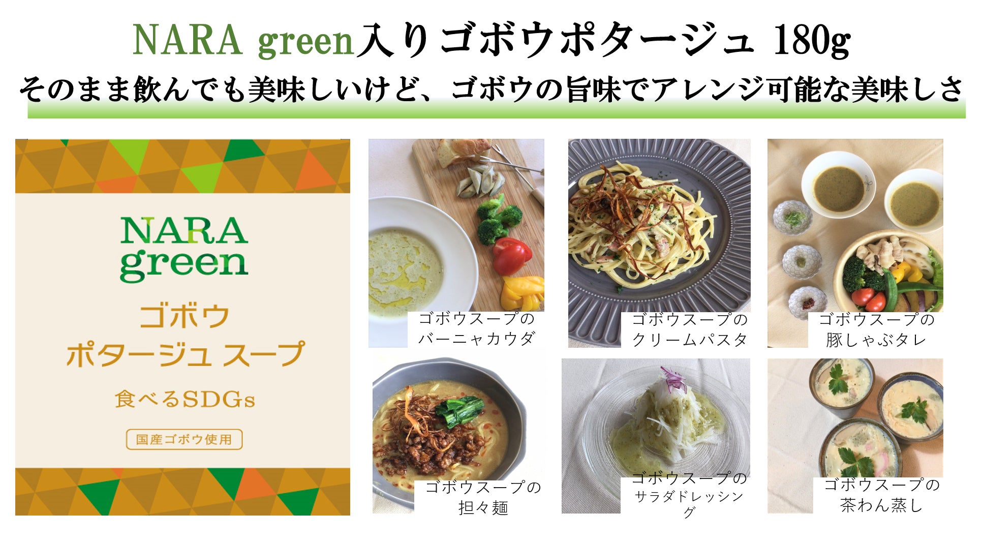 調整豆乳(大豆(カナダ産)、水あめ、食塩、ごぼう、玉葱、NARAgreen(小松菜、チンゲン菜、水菜)、バター、乾燥スープ(コンソメ)/安定剤(カラギナン)、調味料(アミノ酸等)、カラメル色素、香辛料抽出物、酸化ケイ素、酸味料、ビタミ