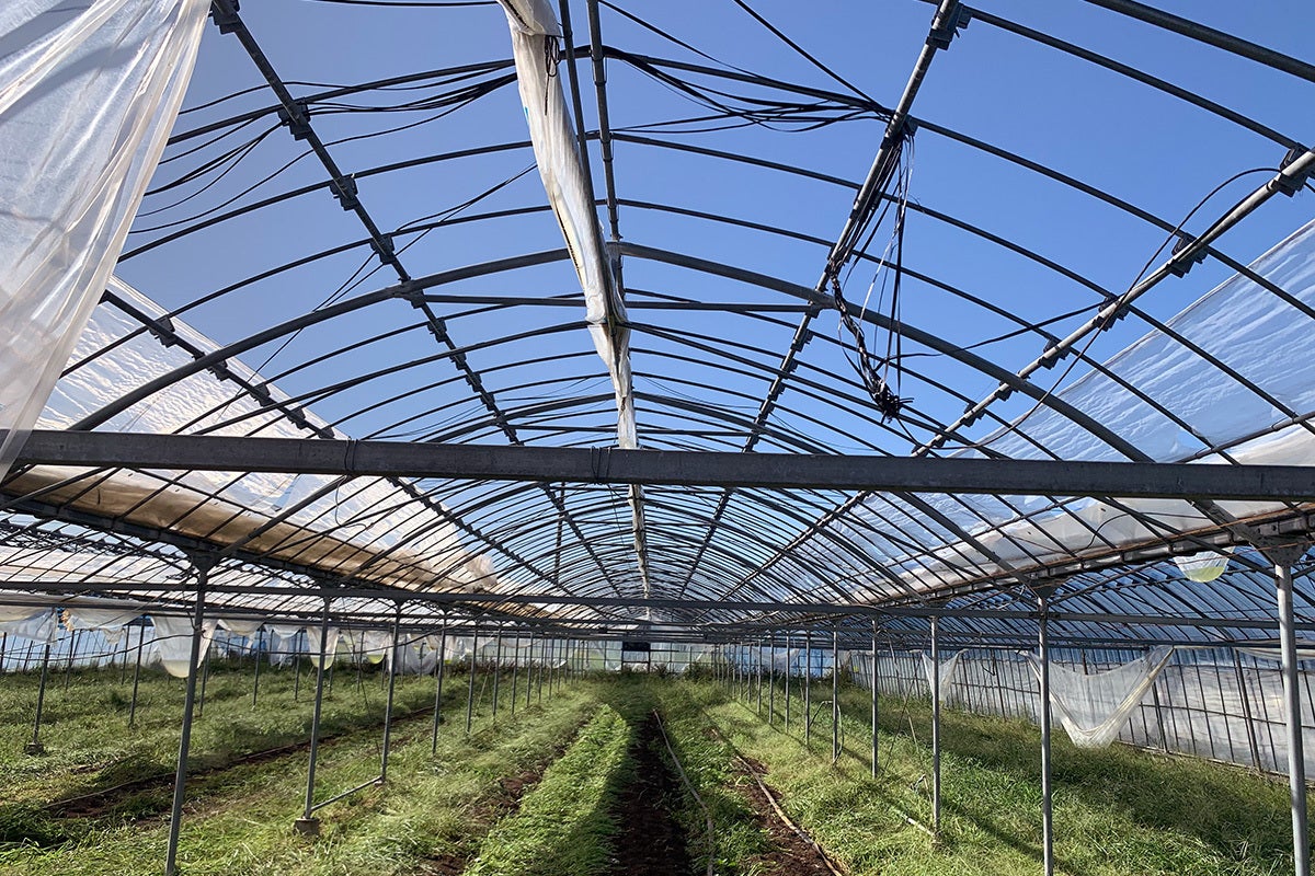 (天井が吹き飛んでしまった作業用ビニールハウス)