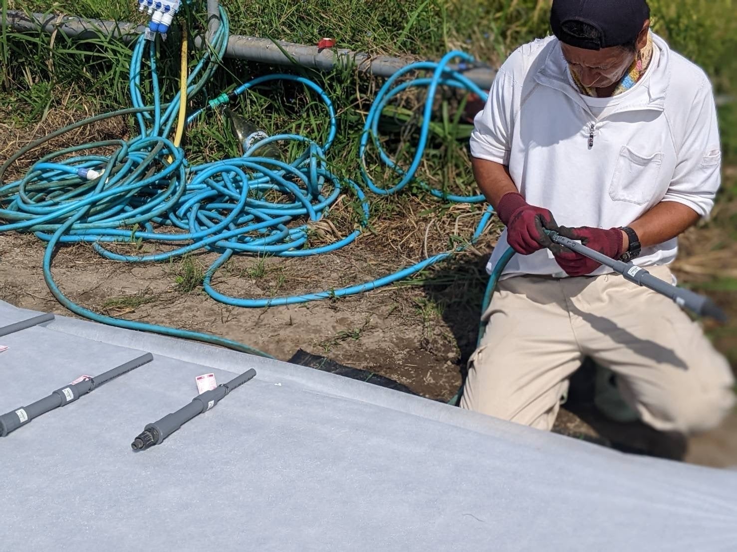 昨日完成した「底面灌水※自動灌水(仮)」ですが、やはりトラブル発生です。。。底に敷いていた不織布が水を含んでくれず、給水された水が窪みに溜まってセルトレイごと水没してしまいました。。。「国分種苗」さんにも知恵をお借りしながら、なんとか形にすることができました!(みんなで新品の不織布をもみほぐしています)主婦の方はさすが布の特性を熟知してらっしゃるので、不織布をガンガン揉みほぐしていました。吸水性も改善されて、なかなかいい感じに仕上がったんじゃないかと思います。これでガンガン苗作りが捗りますねー!