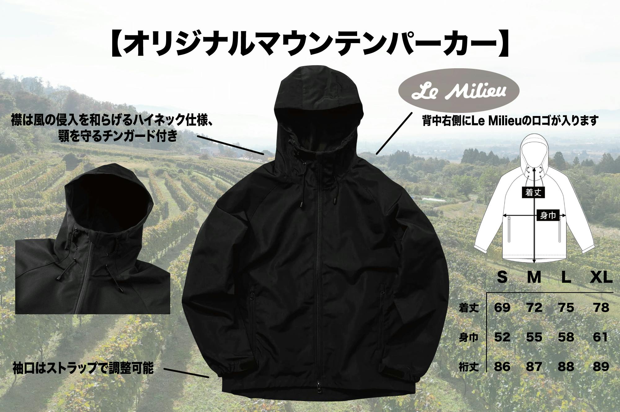 スタッフが畑作業や醸造などで着用しているロゴ入りマウンテンパーカー