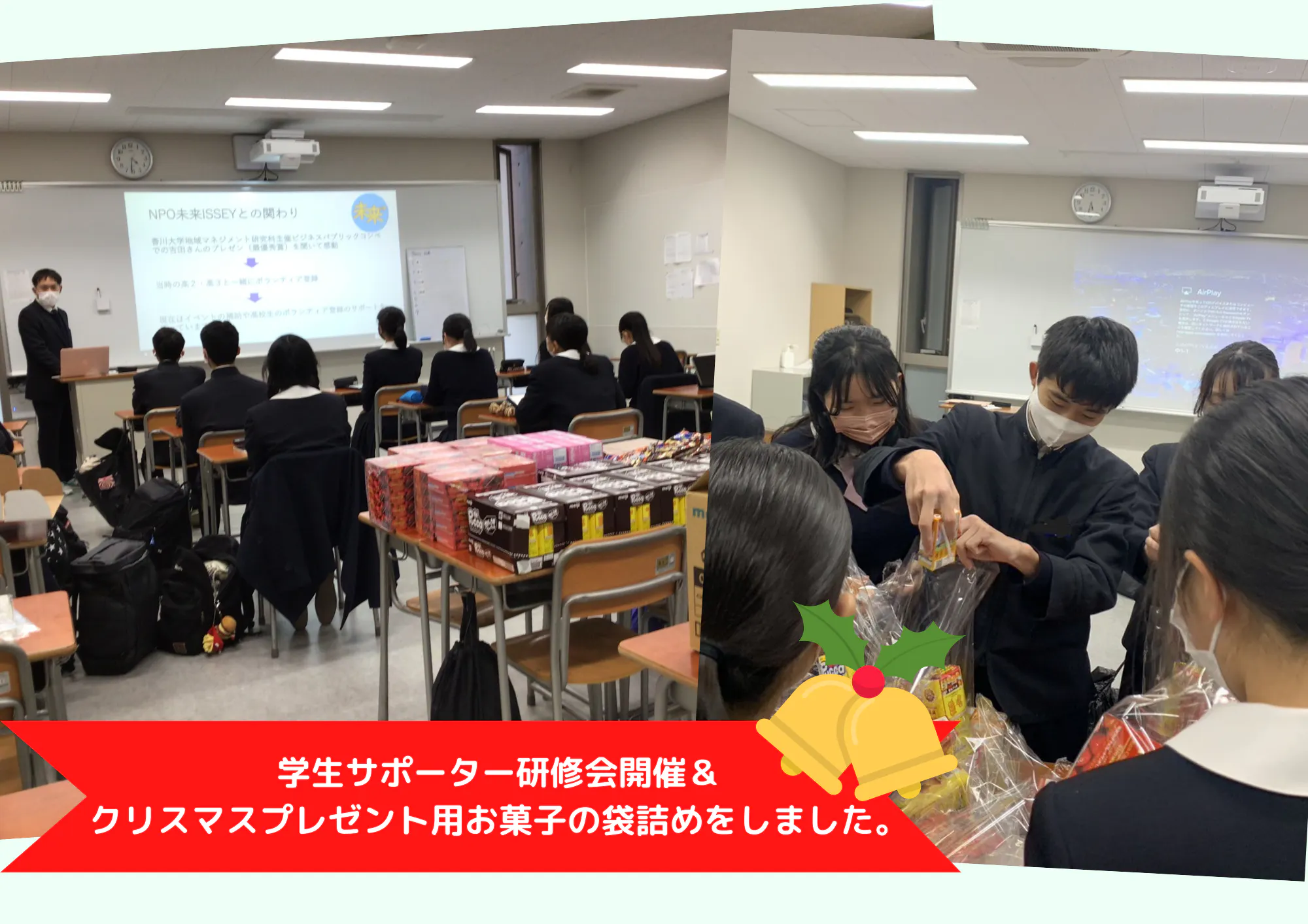 またその後、明治ホールディングス株式会社株主の皆さまより未来ISSEYにご寄付いただいたお菓子を高校生・大学生で袋詰めしました。