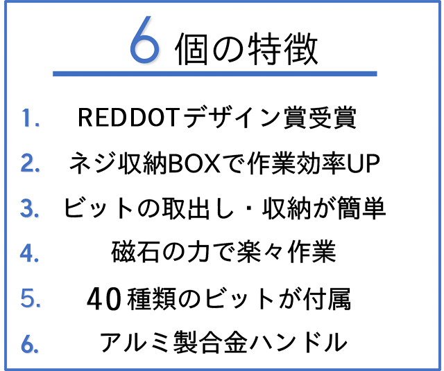 ドライバーハンドル先端と、下段ケースビット収納部には磁石が内蔵されており、ビット交換時にカチッとビットを固定するため、ビットを落としてしまう心配が要りません!