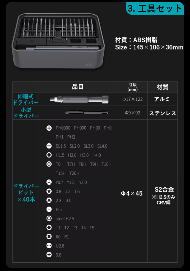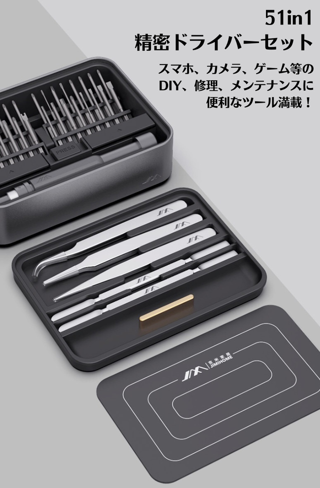 JIMIBOX 2.0には、DIYや精密機器の修理で活躍する全51種のツールが揃っているため、追加でビットやピンセットなどのツールを購入する必要はありません。