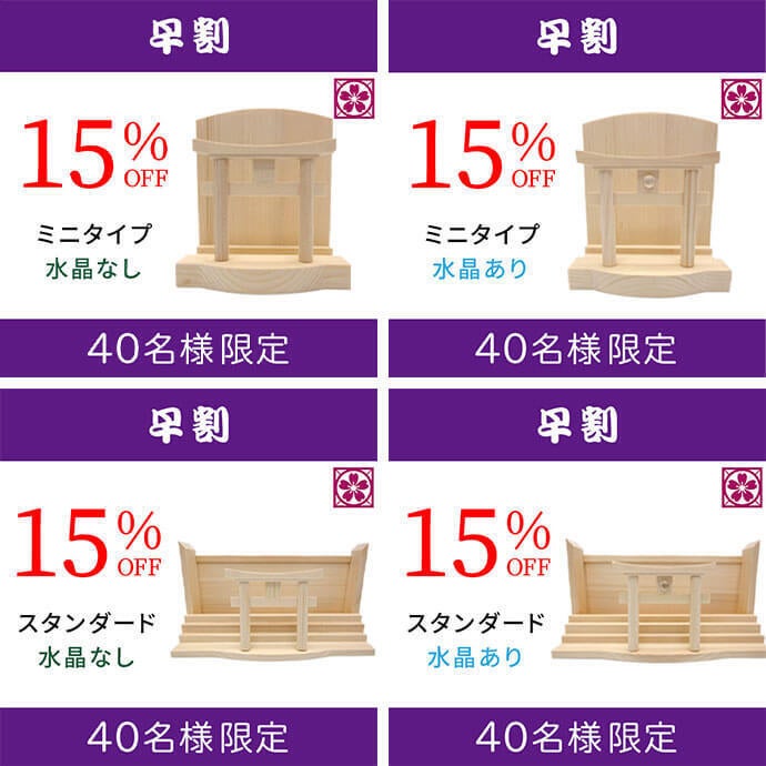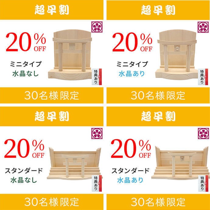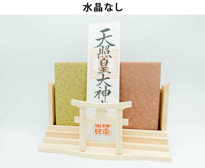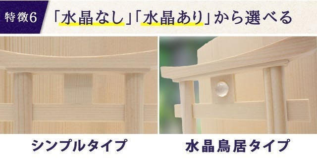 特製鳥居は、水晶がないシンプルタイプと浄化と開運に通じる本水晶を配した水晶鳥居タイプの2種類をご用意。ご予算に応じてお選び頂けます。