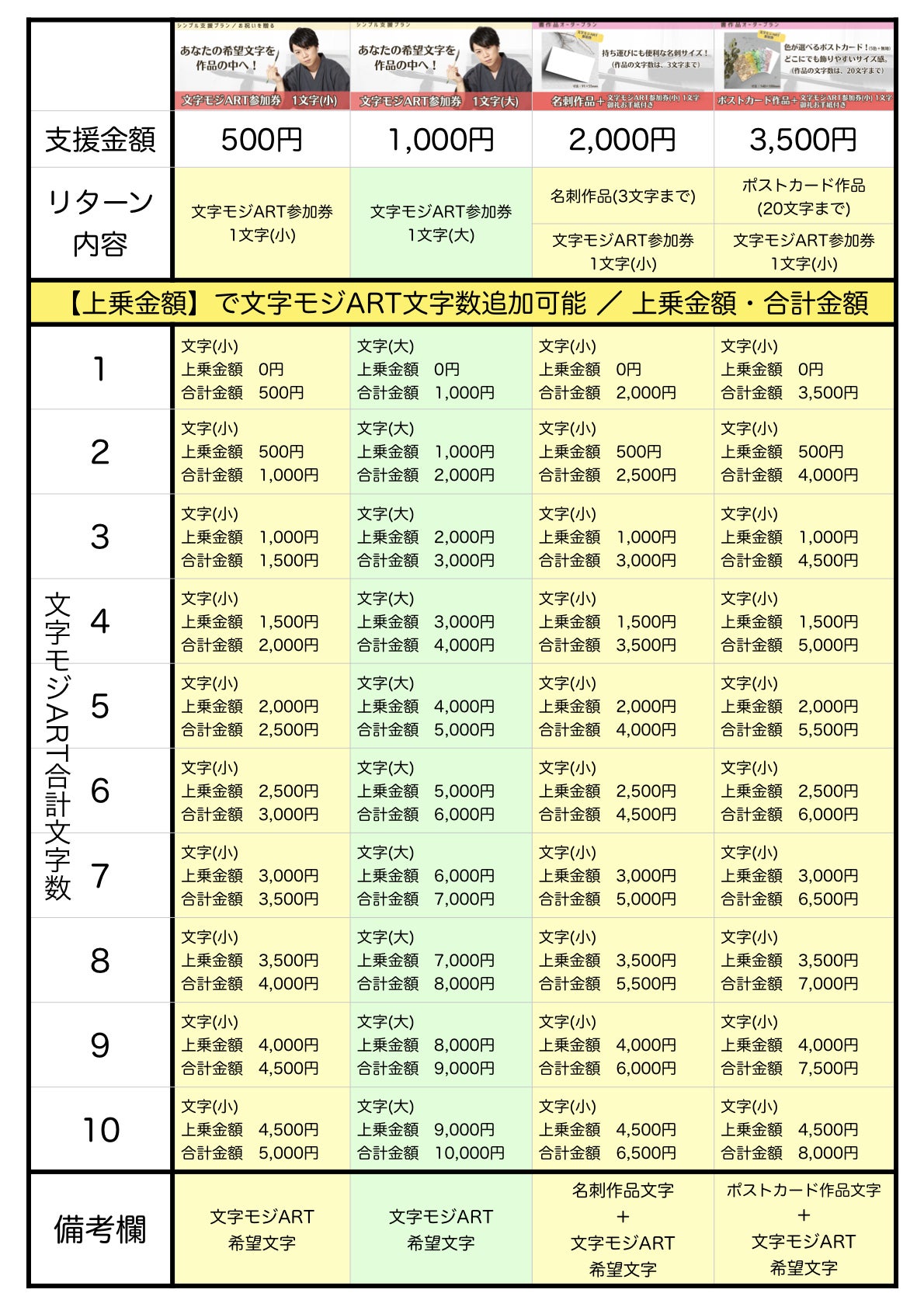 各リターンの詳細に記載しておりますが、少し分かりにくいため、複数文字数を希望される方へ「リターン金額+上乗せ金額=合計金額」を一覧にまとめました。