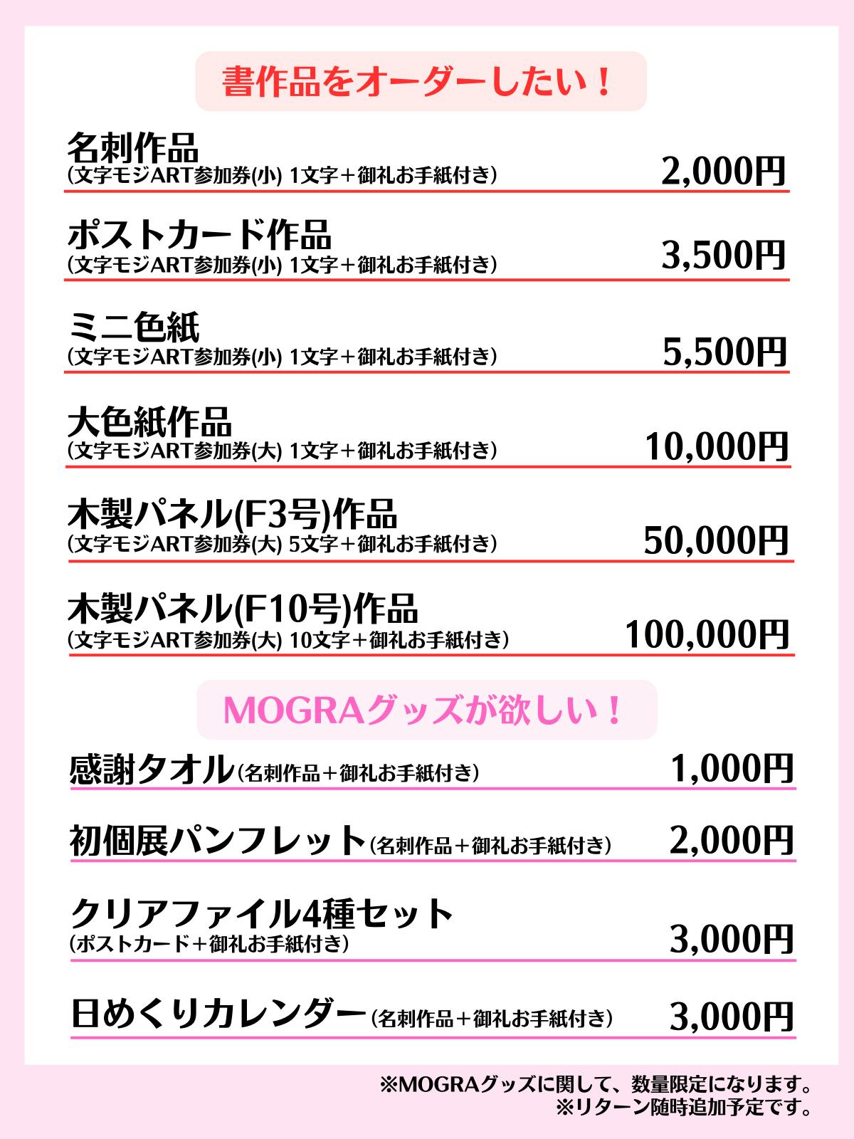 2023/11/01 12:00皆さん、こんにちは。10/25~10/31 「MOGRA solo EXHIBITION 2023 in OSAKA」が無事終了しました。大阪では2回目の個展となりました。搬入&設営にかなり時間かかりましたが、福岡・愛知に展示した全ての作品を展示することができました。遠方からの来てくださった方や海外からのお客様、いつも応援してくださる方、BARに来られた常連様など、本当にたくさんの方にご来場頂きました。また、誕生日や出産祝いなどお店のサプライズにも協力させて頂きました。オリジナルグッズ以外にミニフレーム作品もたくさんの方のお手元に届けることが出来ました。今回、個展を3都市で回らせて頂き、振り返ってみればあっという間の2ヶ月間でした。少し寂しい気持ちもありますが、オーダー作品制作やクラファンリターンなどやることが山ほど溜まっています。少しでも良い作品をお届けできるよう頑張りますので、今しばらくお待ちください。【Sponsors for the EXHIBITION】・株式会社3S-Planner 様 〒433-8119 静岡県浜松市中区高丘北3丁目14-10(https://3s-planner.com)・一般社団法人 SVAHA 様・??? 様・みなみ住宅設備 様・MOGRAを応援し隊隊員 様・kj609. 様・あやまる 様・吉祥花文字 彦(げん) 様その他、クラウドファンディングにてご支援頂きました沢山の皆様、本当にありがとうございます。┈┈┈┈┈┈┈┈┈┈【BARが会場!】流派や派閥関係なく、書道の魅力を伝えたい!美術館出展受賞作品や未公開作品など、多数展示します。MOGRAオリジナル作品である文字でモジを書く「文字モジART」や和紙を貼り合わせた「木製パネル作品」は、昨年より進化した作品をご覧下さい。また、謎解きやワークショップも同時開催します。━━━━━━━━━━━━━━━『MOGRA solo EXHIBITION in OSAKA』日時:2023年10月25日(水)~10月31日(火) 平日 15:00~22:00 土日 14:00~22:00 (最終日のみ 14:00~18:00)会場:DRAM HOUSE THE ROOT 〒543-0002 大阪府大阪市天王寺区上汐3-1-3 大阪メトロ谷町線/谷町九丁目駅(徒歩4分) 近鉄大阪線/大阪上本町駅(徒歩7分)備考:1ドリンクオーダー制(500円~)━━━━━━━━━━━━━━━【謎解き】会場内にあるキーワードを元にLINEを使って謎解きができます!!正解するとミニ書作品プレゼント!!(参加費:500円)【ワークショップ】書道アーティストが教えるコツで、あなたも美文字が書ける!学校では教えてくれないバランスの良い美文字を筆ペンを用いて漢字1文字を伝授します!┈┈┈┈┈┈┈┈┈┈所要時間:30〜60分持ち物:特になし参加費:1,000円(税込)プレゼント:見本+美文字テキスト(A4サイズ1枚)┈┈┈┈┈┈┈┈┈┈各回4名までの定員となります。ご予約は先着順とさせていただきますので、お早めにご確保ください。【平日】随時受付中!(最終日は16:00まで)【土日】15:00〜/17:00〜/19:00〜書道アーティストMOGRA#MOGRA #MOGRA書道 #書道アーティスト #書道家 #calligraphy #文字モジART #ぺんてる #呉竹 #筆ペン #書道作品 #書道 #書道好きな人と繋がりたい #書道好きと繋がりたい #art #個展 #ギャラリー #EXHIBITION #上本町 #大阪 #BAR #ドラムハウスザルート #謎解き もっと見る#30_【限定ライブ配信】大阪会場より
