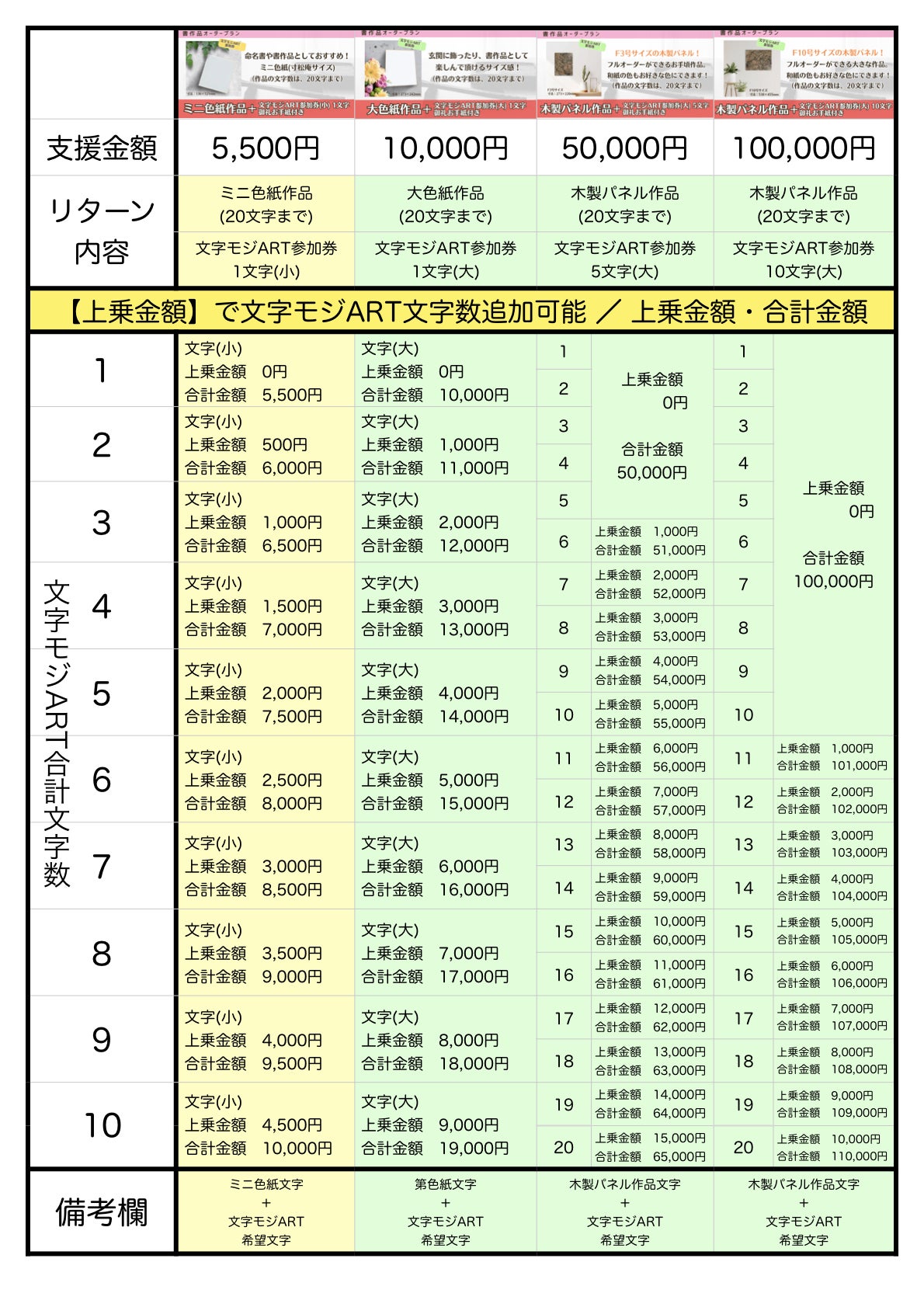 各リターンの詳細に記載しておりますが、少し分かりにくいため、複数文字数を希望される方へ「リターン金額+上乗せ金額=合計金額」を一覧にまとめました。