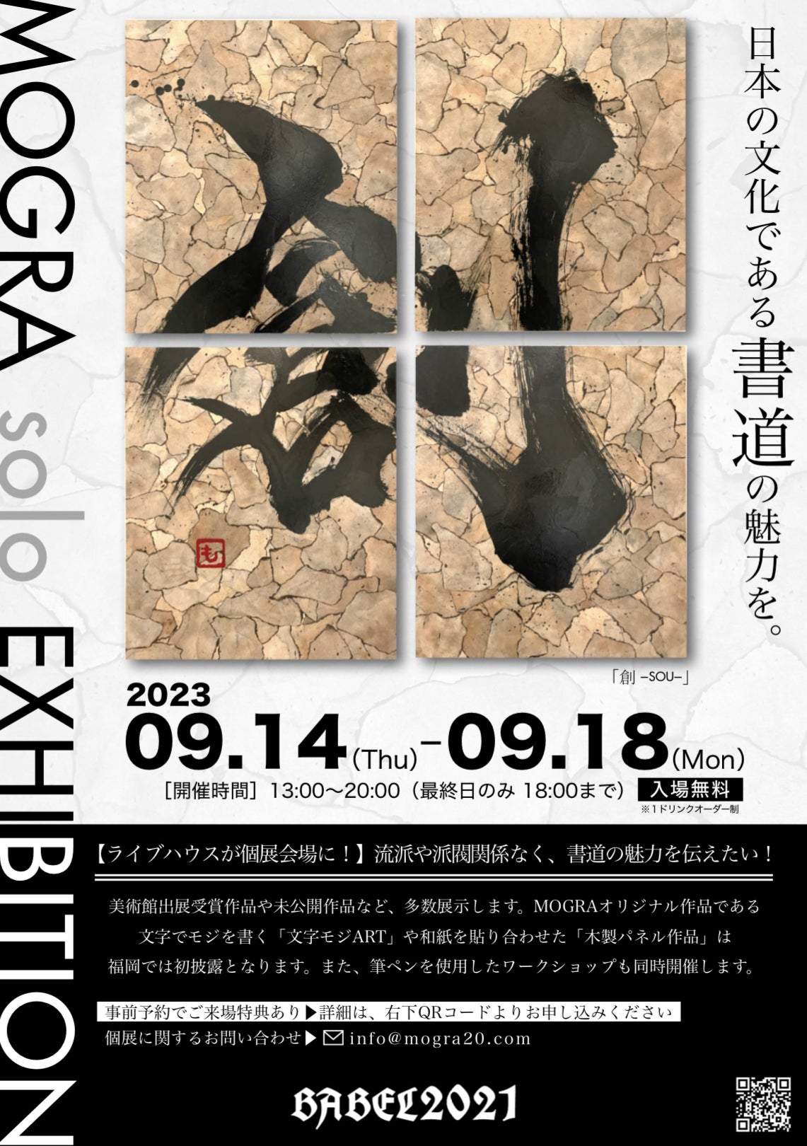 9/14-9/18 「MOGRA solo EXHIBITION 2023 in FUKUOKA」が無事終了いたしました。昨年に引き続きBABEL2021様のご協力もあり、無事開催することができました。初個展より大きな作品が多く、搬入から飾り付けまで大変ではありましたが、会期中は謎解きやワークショップなども行い、沢山の方に作品を見て頂くことができました!!遠方からご来場頂いた方、前職の会社の同期や作家さん、昨年に引き続き見に来てくださった方、初めましての方も、喜んで頂けた個展となりました。引き続き、9/21-9/24は名古屋での開催となります。ゆかりある地での開催が楽しみです!【Sponsors for the EXHIBITION】・株式会社3S-Planner 様 〒433-8119 静岡県浜松市中区高丘北3丁目14-10 (https://3s-planner.com)・一般社団法人 SVAHA 様 (https://svaha.asia/)・??? 様・みなみ住宅設備 様・MOGRAを応援し隊隊員 様・kj609. 様・あやまる 様・吉祥花文字 彦(げん) 様その他、クラウドファンディングにてご支援頂きました沢山の皆様、本当にありがとうございます。┈┈┈┈┈┈┈┈┈┈【名古屋 初開催!】流派や派閥関係なく、書道の魅力を伝えたい!美術館出展受賞作品や未公開作品など、多数展示します。MOGRAオリジナル作品である文字でモジを書く「文字モジART」や和紙を貼り合わせた「木製パネル作品」は名古屋初披露となります。また、筆ペンを使用したワークショップも同時開催します。━━━━━━━━━━━━━━━『MOGRA solo EXHIBITION in AICHI』日時:2023年9月21日(木)~9月24日(日) 13:00~19:00 (最終日のみ 17:00まで)会場:Gallery White Cube Nagoya Japan 〒460-0002 愛知県名古屋市中区丸の内2-15-28 ビッグベン丸の内4階 地下鉄丸の内駅2番または3番出口より徒歩1分備考:エレベーターがありません。4階まで階段になります。予めご了承ください。━━━━━━━━━━━━━━━【ワークショップ】書道アーティストが教えるコツで、あなたも美文字が書ける!学校では教えてくれないバランスの良い美文字を筆ペンを用いて漢字1文字を伝授します!┈┈┈┈┈┈┈┈┈┈所要時間:30〜60分持ち物:特になし参加費:1,000円(税込)プレゼント:見本+美文字テキスト(A4サイズ1枚)┈┈┈┈┈┈┈┈┈┈各回4名までの定員となります。ご予約は先着順とさせていただきますので、お早めにご確保ください。•14:00〜/15:30〜/17:00〜書道アーティストMOGRA