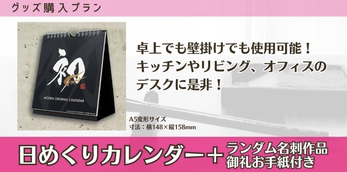 プロジェクトページをご覧頂きありがとうございます!!今回はリターンの中の【日めくりカレンダー】をご紹介!毎日使える31日分の日めくりカレンダーは、壁掛けでも卓上でも使える2way仕様となります。31日分全て異なる漢字が書いてあり、一言メッセージも入ってます。制作にあたり、このカレンダーをご購入してくださった方が、日々の生活の中で文字に触れたり、書を感じ取って頂けたらと思い、作ったものになります。今回は第2弾の日めくりカレンダーとなりますが、今回のカレンダーも自分で言うのもあれですが、ホントに凄いんです!!例えば「9日」って毎月「9日」が来ます!だから、普通に考えたら、日めくりカレンダーの文字は同じで、メッセージも同じなんです。←当たり前(笑)しかし、皆さんが抱えてる問題や悩み、気持ちは全く同じではないはずです。だから、このカレンダーが伝えているメッセージの受け取り方が違ってきます!もちろん、朝見る人もいれば、仕事が終わってから目にする人もいるわけです。そして、このカレンダーが凄いのは、皆さんの出来事とリンクすること!!既にご購入して頂いている方からも多くのお声を頂いています。「またカレンダーとリンクした!」「このカレンダーのメッセージに救われた。」「今日も頑張れる」など…。文字の力を信じて、皆さんへ何か届くものはないかと、文字を書き、メッセージを考えています!!書道の魅力は様々なところで発揮してきます!是非このカレンダーで体験してみてはいかがでしょうか?毎日Instagramのストーリーに毎日アップしていますが、是非、実物を手に取って頂き、文字の力を感じ取って頂けたら幸いです!!(Instagram▶︎@mogra_shodo)※必ずリンクする保証はありません。あくまでも個人の感想であるので、ご理解ください。書道アーティスト MOGRA