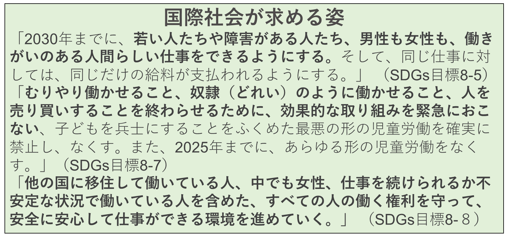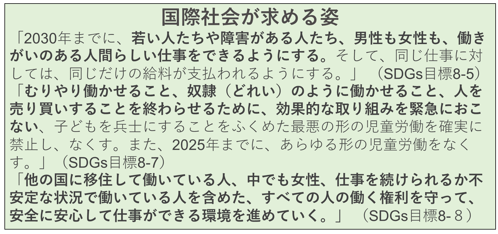 まさにSDGs目標8、すべての人々に働きがいのある人間らしい仕事に就いてもらいたいと思います。在日外国人、障害者、高齢者や母子家庭の母などの就職困難者は様々な問題をかかえています。