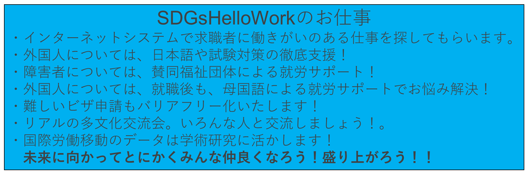 外国人のみならず、障害者、高齢者、シングルマザーなど、行政のハローワークより、一歩前に出て手を差し伸べる(伴走支援する)ハローワークが必要だと思うに至りました。「転職の自由がある」=「生活の保障がある」からこそものが言える、すなわち人権が保障されると考えます。