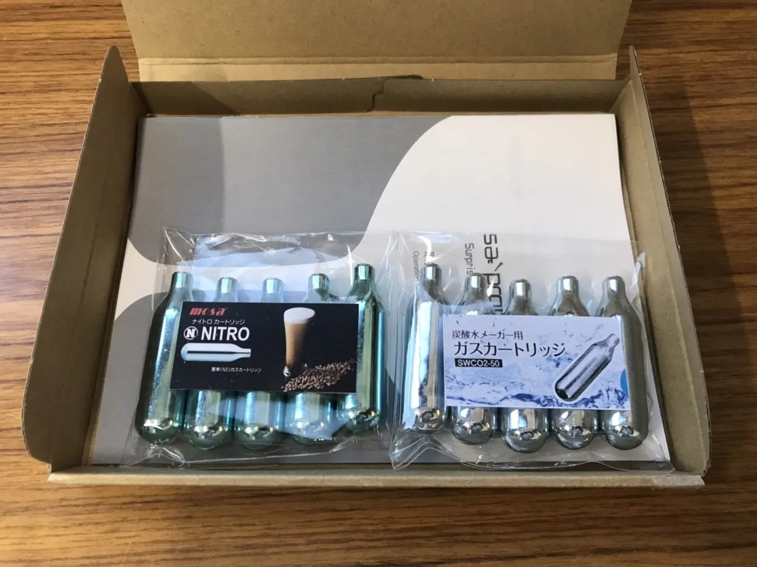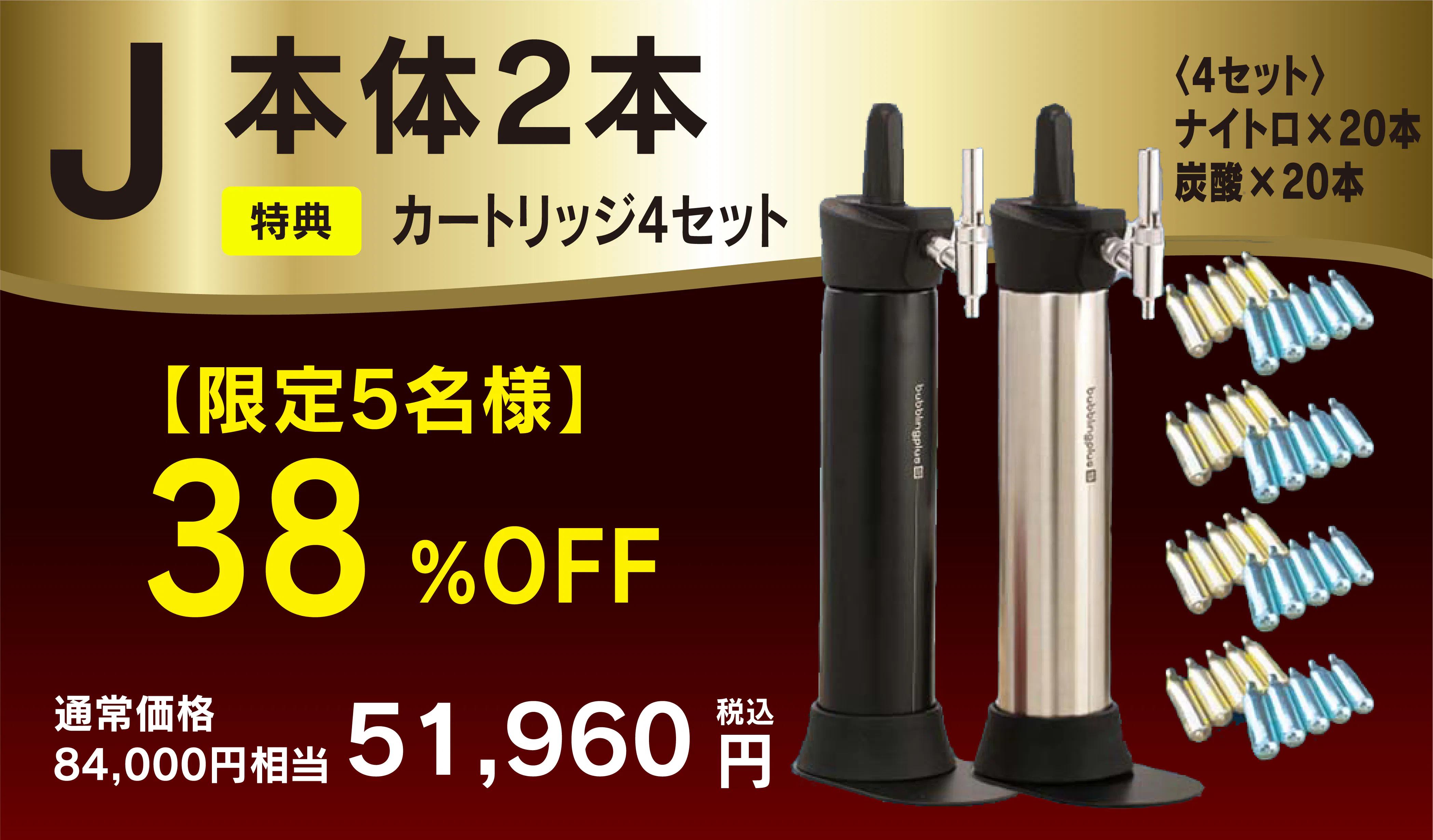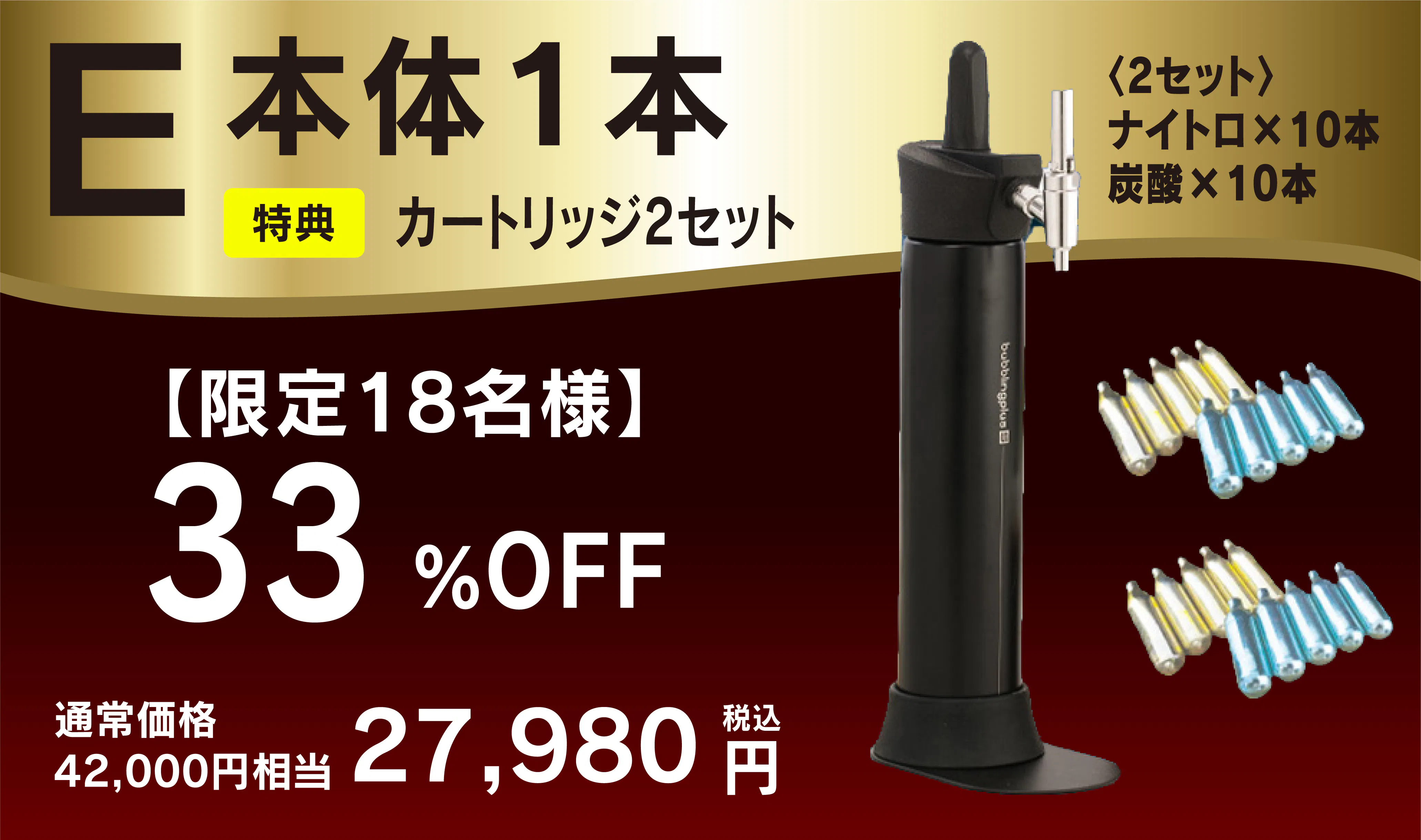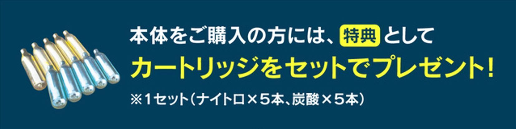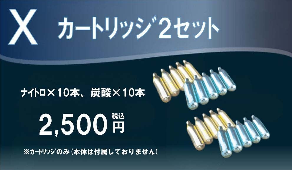 本商品は別売りのガスカートリッジが必要となっておりますが、今回に限り商品到着後すぐに使用していただけるよう、特別にCO₂(炭酸)N₂(窒素)のカートリッジをセットにいたします。※カートリッジ本数はリターン毎に異なります。