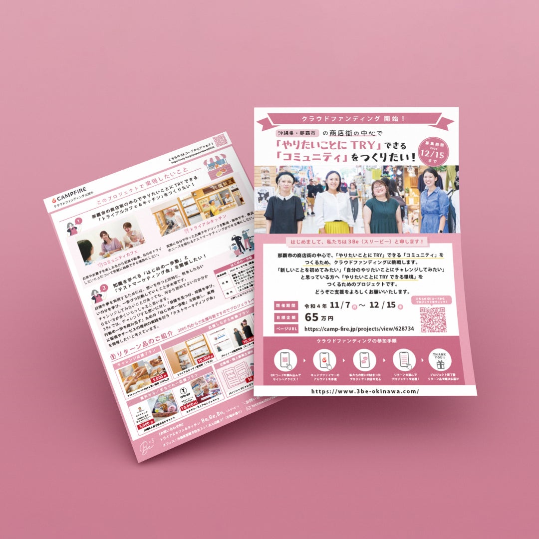 このフライヤーではA4用紙1枚でいかにクラウドファンディングへの取組み、リターン品など、情報がわかりやすく伝えることができるか考えてながら制作しました。