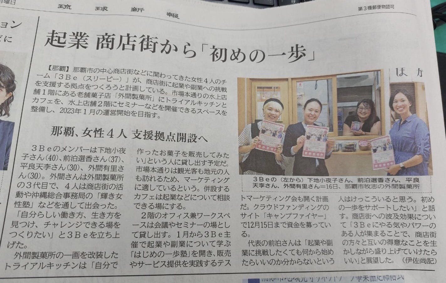 先日、沖縄県の地元新聞社「琉球新報」さんに3Beを取材して頂き、11月28日の朝刊に掲載頂きました!