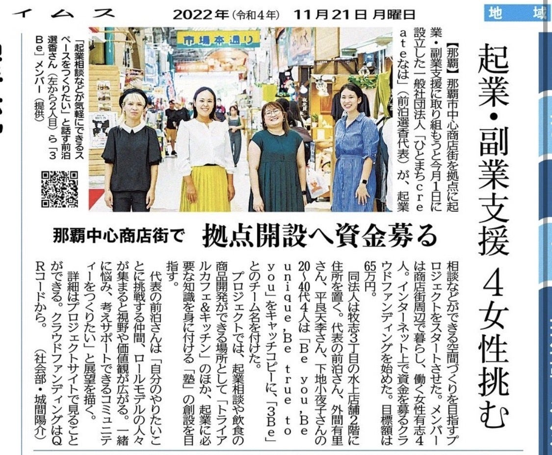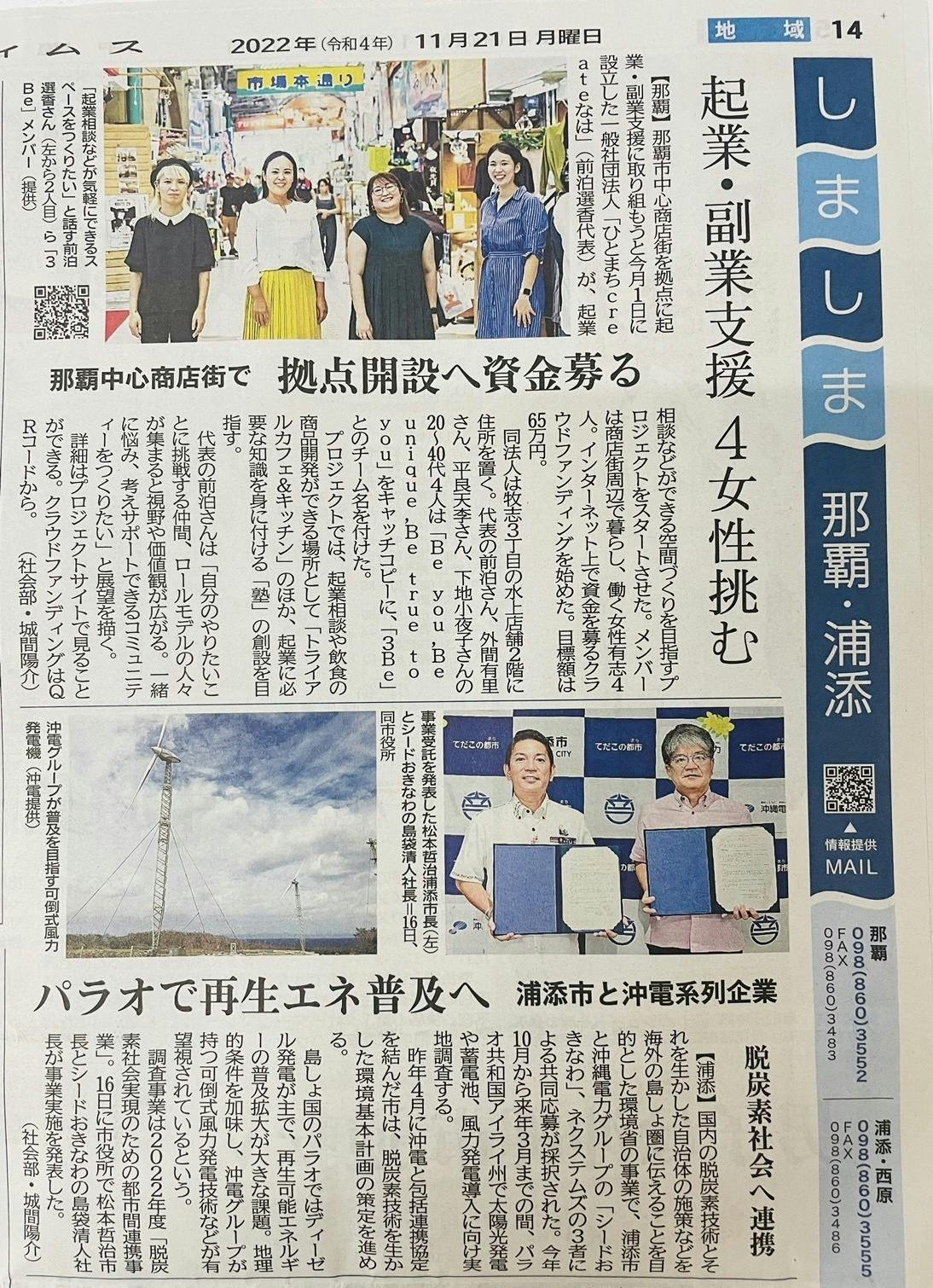 2022年11月21日朝刊14面、沖縄県の新聞社「沖縄タイムス」さんに3Beのクラウドファンディングについて掲載頂きました!