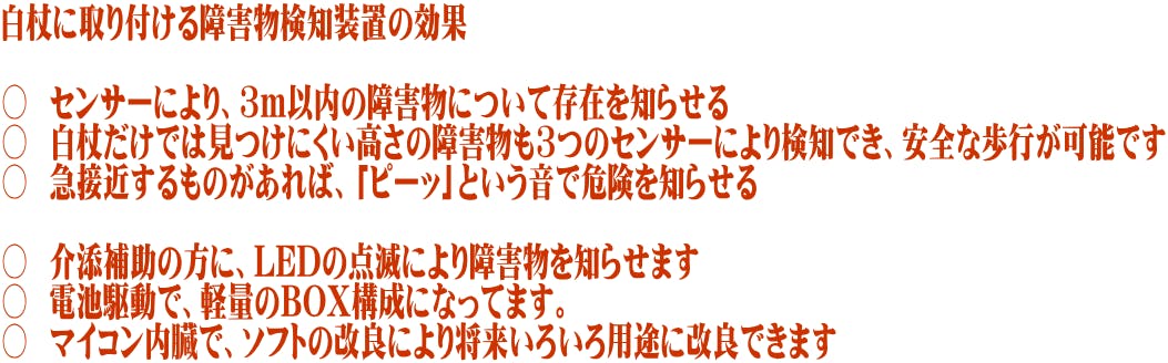 白杖は目の不自由な人が歩くために欠かせないものです。障害物検知ユニットで視覚障害者の安全が確保出きることを期待してます。