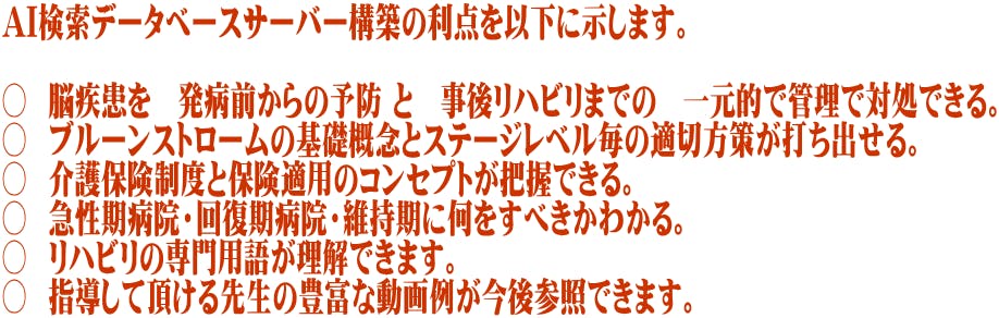 脳梗塞の後遺症はいろいろな症状により日常生活に支障をきたしてしまうものがほとんどです。 多くの方が悩まされているのが運動や感覚に障害をきたす麻痺や言語障害、そして認知機能です。それらに対処する為のデータベース検索エンジンサーバー構築は必要と考えます。