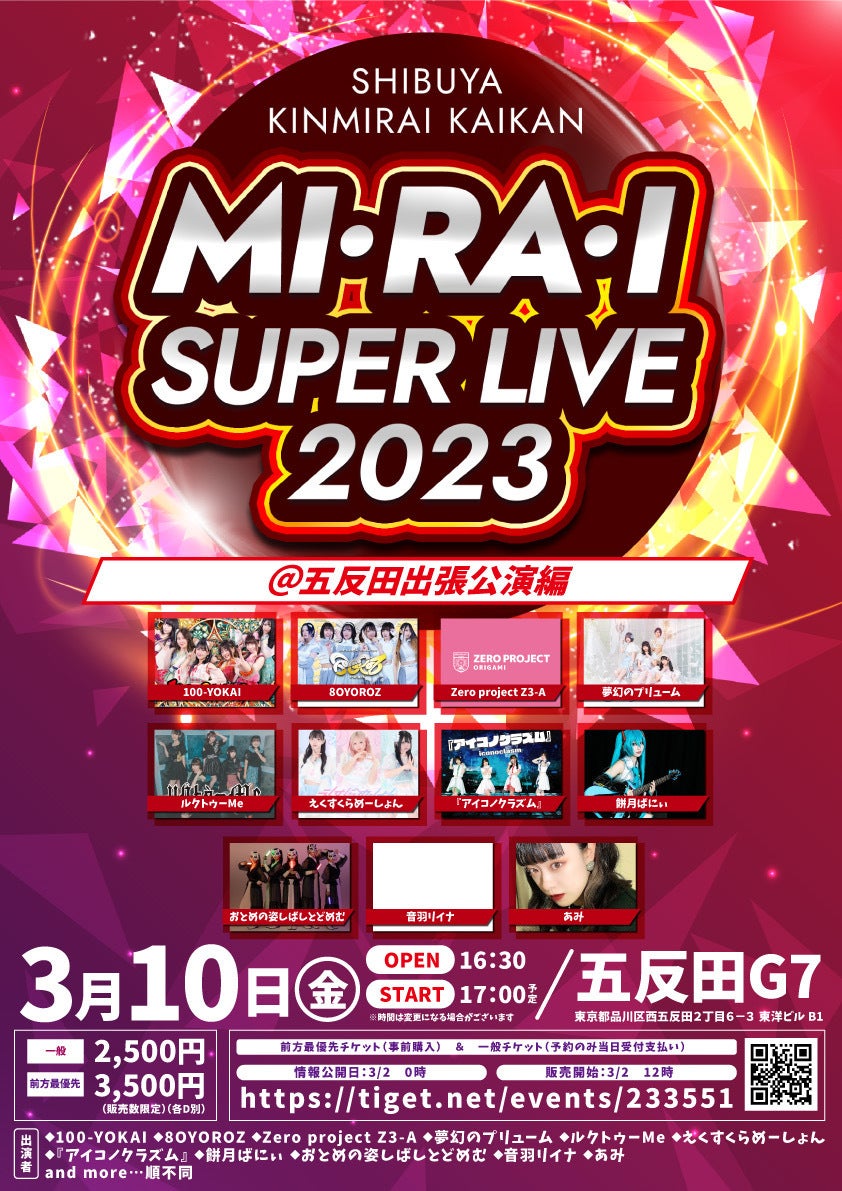 2023/03/06 19:30クラウドファウンディング認知拡大のためライブ活動もしています!次回ライブは「MI・RA・I SUPER LIVE 2023」@五反田出張公演編 日時:3/10(金) 時間: 開場16:30 開演17:00予定※変更される場合ございます 会場:五反田G7 料金:一般2,500円/前方最優先3,500円(販売数限定)(各D別)ばにぃの出番は18時から、 18:30から19:20までライブ会場限定の物販もあります!みんなで最高に時間を作りたい!現場でも一緒に夢叶えませんか? もっと見る