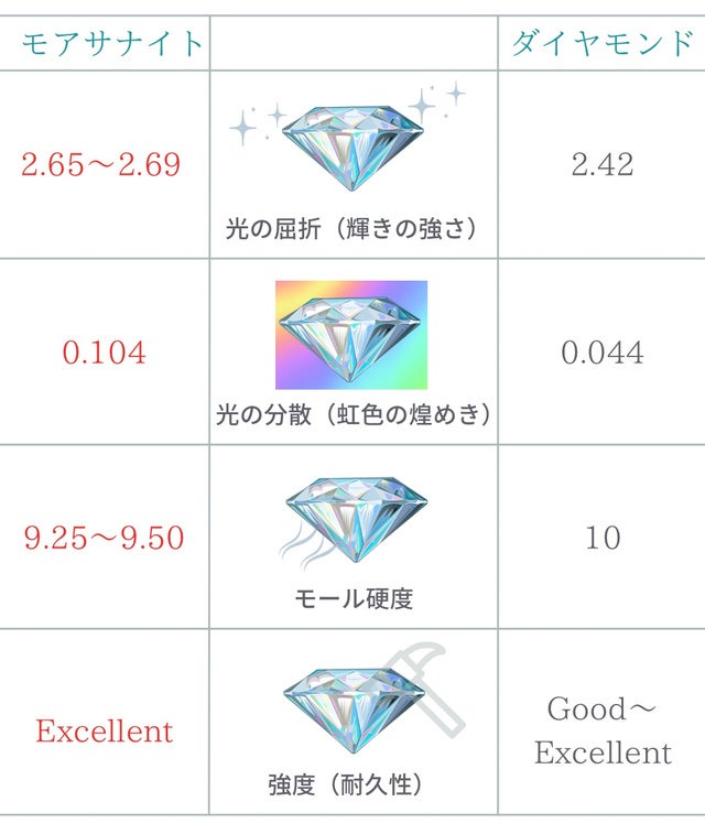 ファイアと呼ばれる光の分散(虹色の輝き)なども、ダイヤモンドに対して約2.5倍もあり、多くの面においてモアサナイトはダイヤモンドよりも優れていることがわかります。