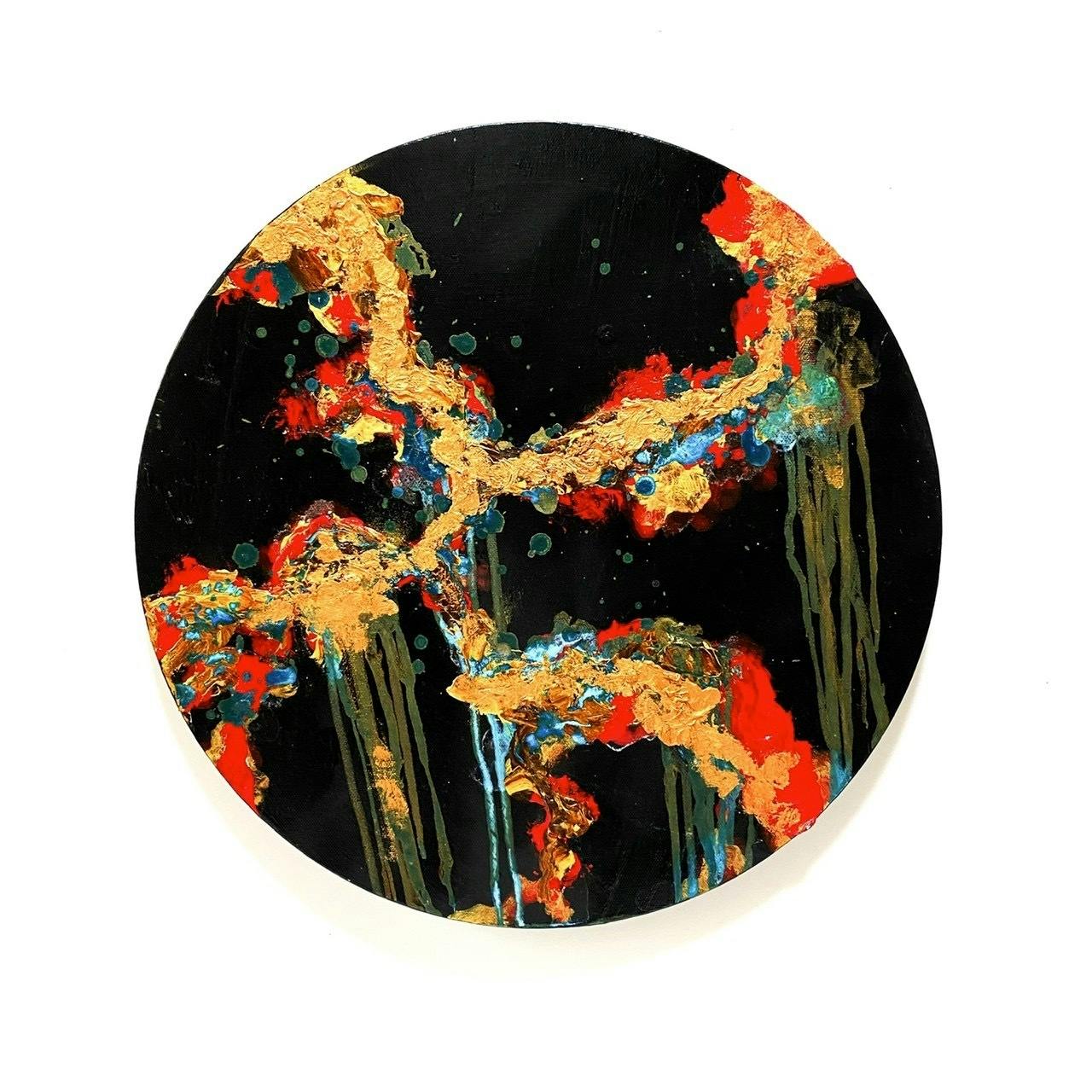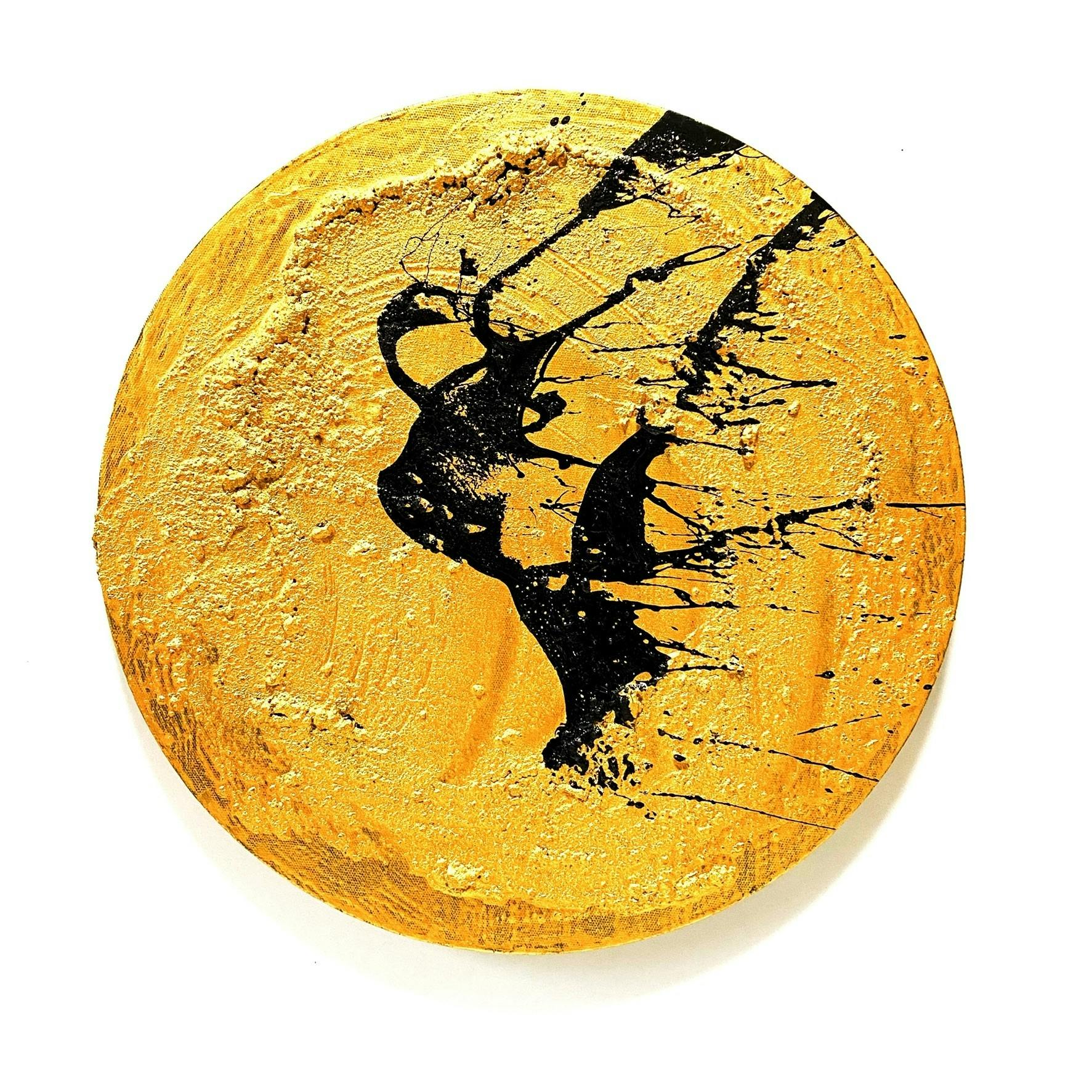 円形の画面は僕の考える魂の形であり、土台となる厳かな黒は揺るぎない信念を表します。その黒に用いているのは、日本を象徴する山である富士山の安山岩です。そして日本画の伝統的な画材である岩絵具を使い、人間の内面にある静と動、生命力を描き出しています。