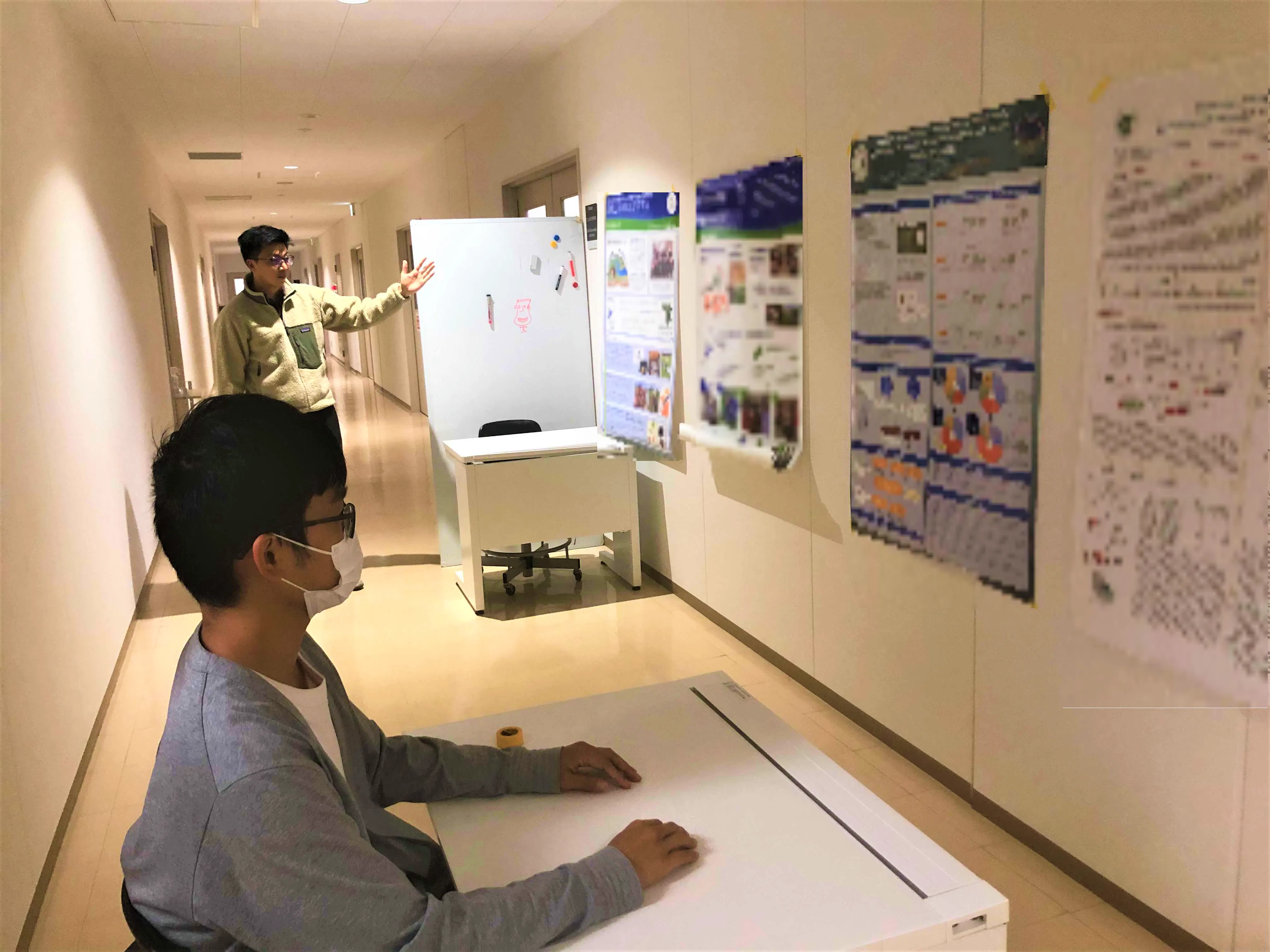 まずはイメージを掴みたいということで、大学院棟の一角で、COP27のブーススペースを想定して発表のシミュレーションを行ってみました。(写真 奥: 高橋、手前: 西峰)