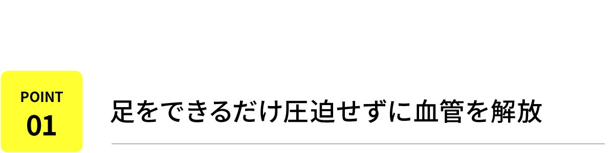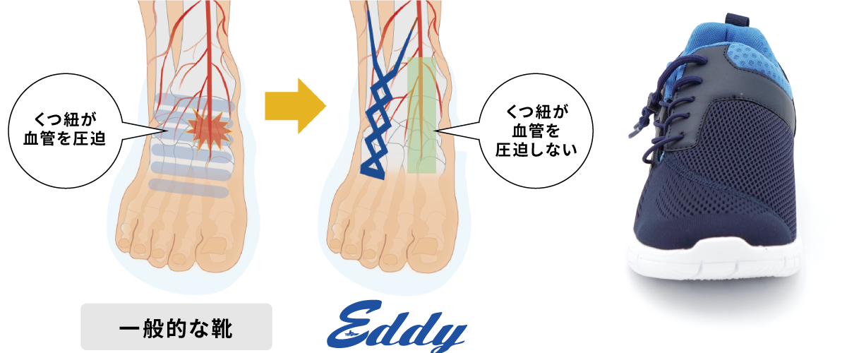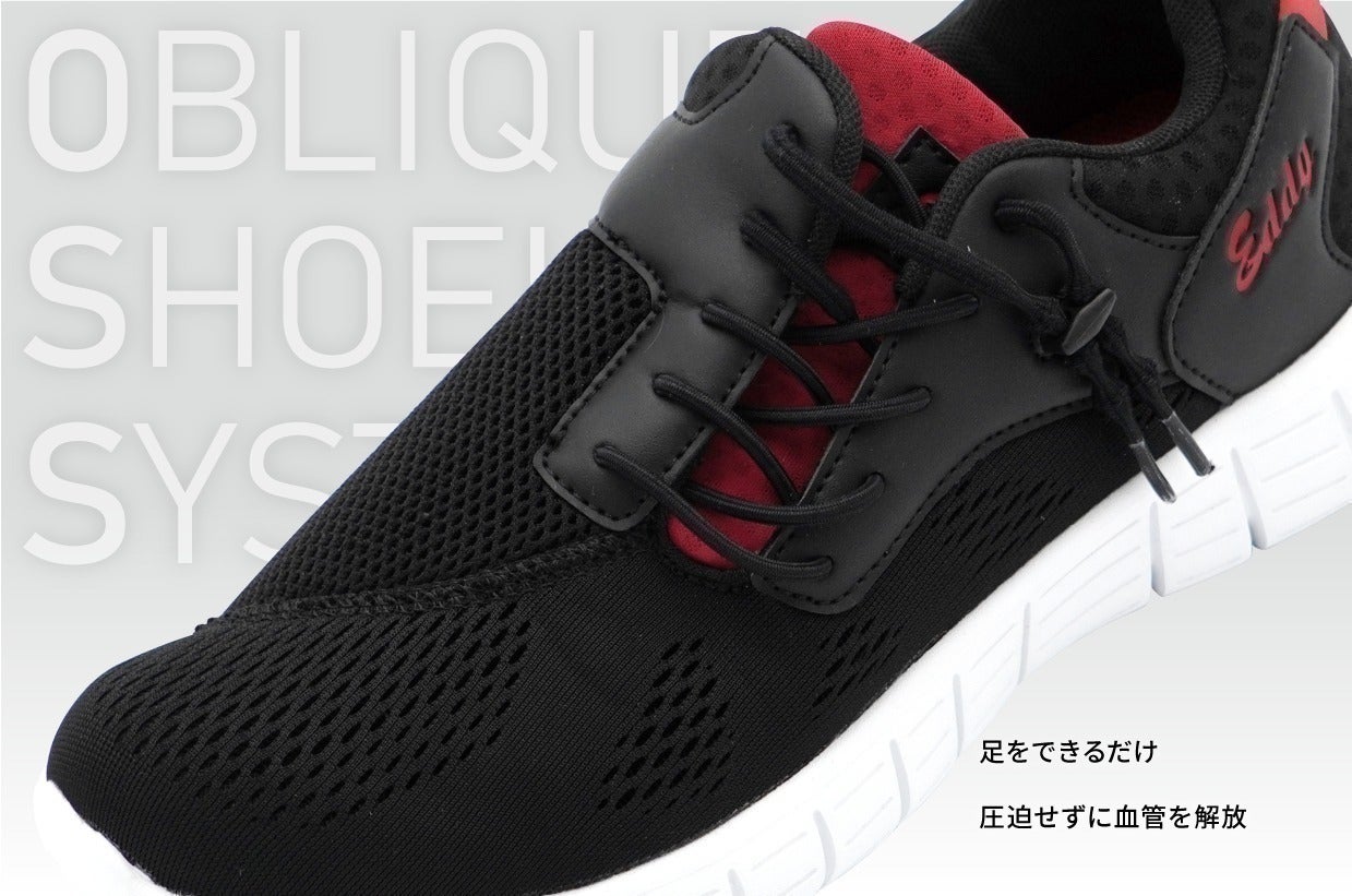 足を圧迫せず、血流を損なわないように血管を解放するため、靴紐の位置を斜めに設置しました。伸縮性があり縛る必要の無い特殊な靴ひもシステムを採用しています。(特許取得)