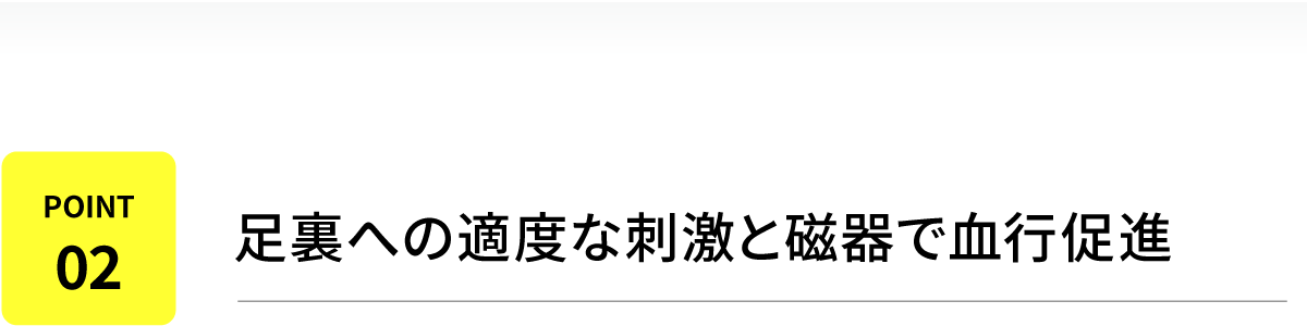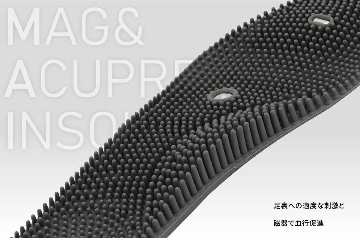 3年間改良を重ね完成した、絶妙な硬さで足裏のツボを刺激し、磁力で血行を促進する”マグ&アキュプレスインソール”と、足裏形状にフィットして優しく足を休ませる”フットベッドインソール”の2種類が付属。使い分けることで効果を最大限に引き出すことができます。