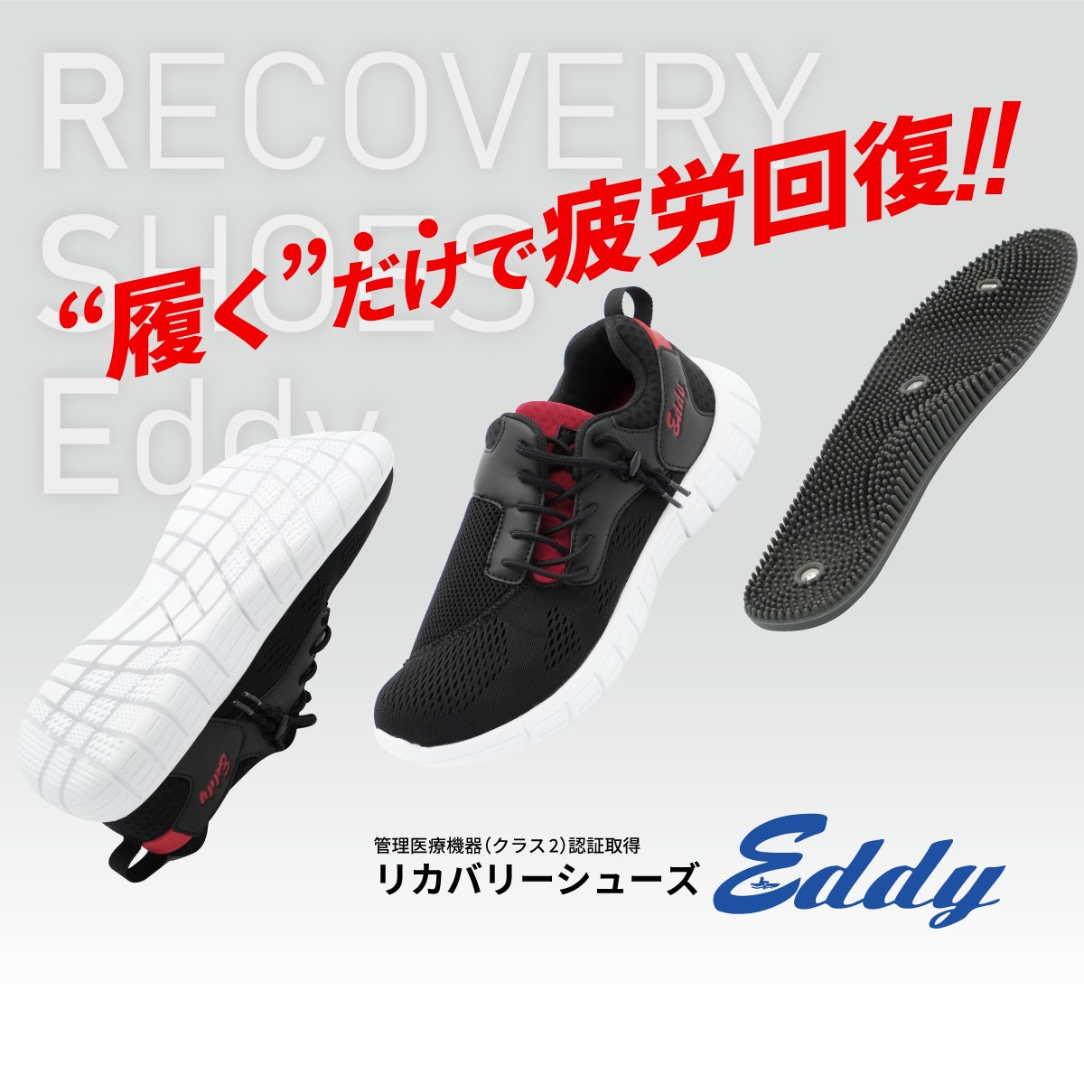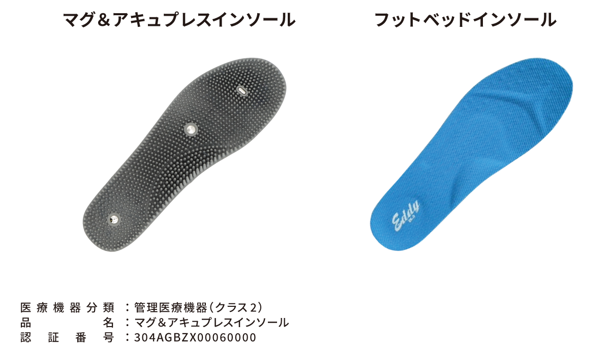 リカバリーシューズEddyは、管理医療機器(クラス2)のマグ&アキュプレスインソールを標準装備しています。