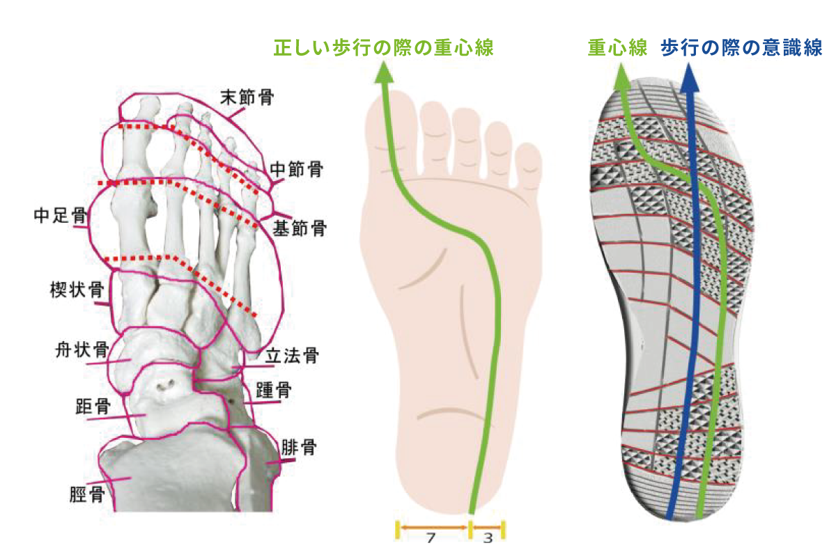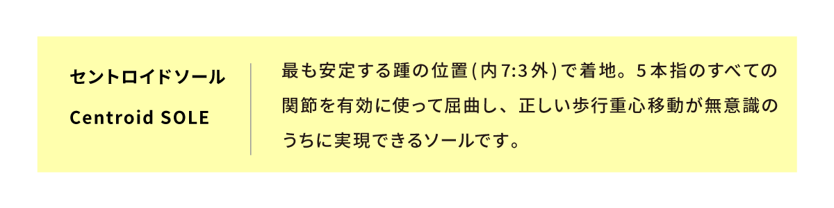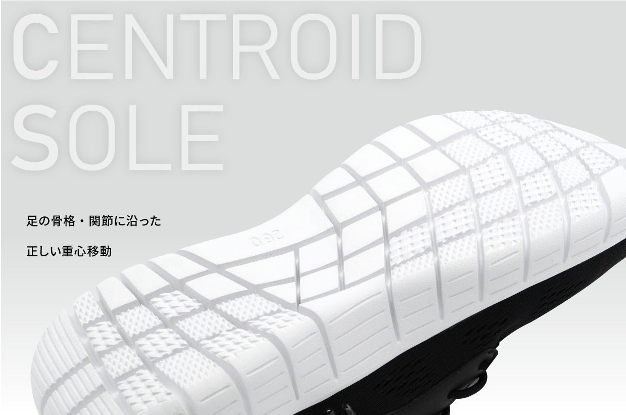 足の骨格に沿って関節を自在に動かし、正しい重心移動を促す意匠のアウトソール”セントロイドソール”は、軽くて柔軟性に富んだうえに丈夫で耐摩耗性が高い独自配合の発泡ゴム”エディフォーム”を使用しています。(特許出願中)