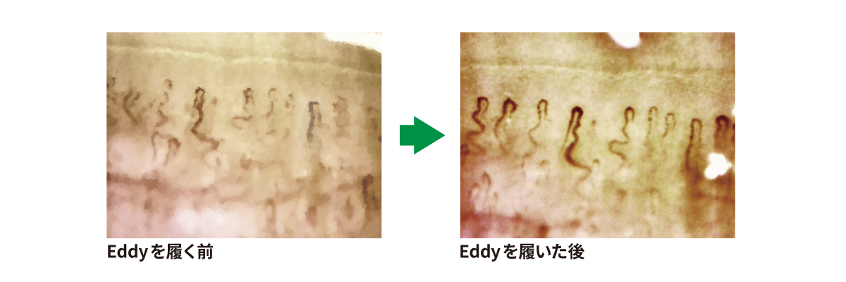 いつも履いている靴で歩行前と180秒歩行後、安静にしてからEddyを履いての歩行前と180秒歩行後を血流スコープで比較視認しても、血行血流が明らかに改善されることが確認できました。
