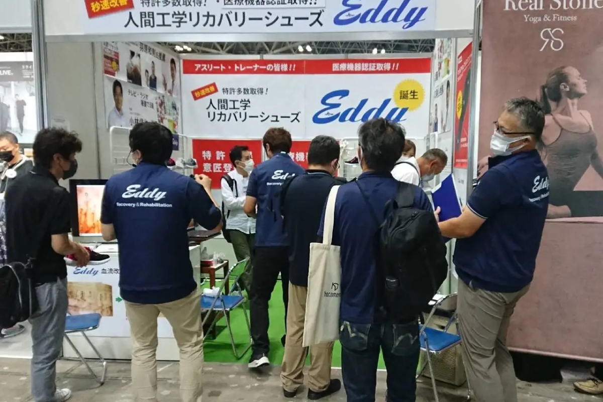 Eddyブースには、初日よりアスリートやスポーツ業界のみならず、医療・福祉・美容業界などいろいろな業界の方が来場し、取引のご希望や商品コラボのオファーをいただきました。実際に履いて歩いた後の血行改善効果を、血流スコープにより視覚的に確認しながら説明を受けた来場者より一つ一つの機能に共感をいただき、さっそくEddyに心を掴まれるファンが生まれ大成功で幕を閉じました。