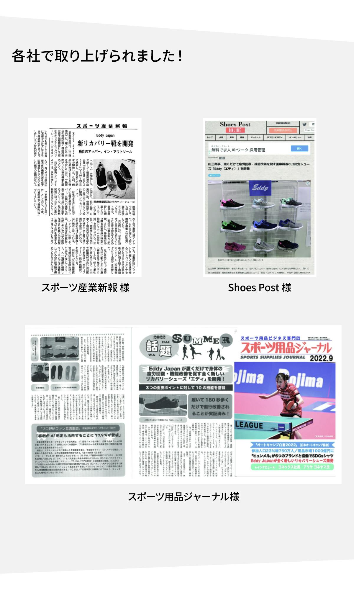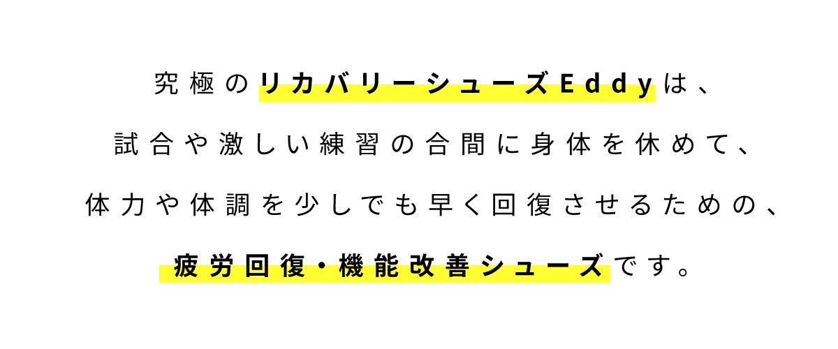 究極のリカバリーシューズEddyは、試合や激しい練習の合間に体を休めて体力体調を少しでも早く回復させるためのシューズであることからEddyと名付けられました。
