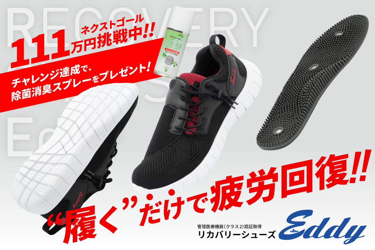 リカバリーシューズEddy初めてのクラウドファンディングもいよいよ最終日となりました。初めてのプロジェクトのため、不備もたくさんあったかと存じますが、みなさまのご支援により当初の目標に無事ゴールを迎えることができました。ご支援いただいたみなさまに、心より感謝申し上げます。今現在も、ネクストゴールに向けチャレンジを行っております!身近に興味をお持ちの方がいらっしゃいましたら、ぜひとも最終日であることをご案内いただけると幸いです。達成できた場合、これまでを含め、ご支援くださったみなさま全員に、除菌・消臭スプレーをプレゼントプレゼントさせていただきます。ラスト1日。 ネクストゴールに向け、ぜひとも、ご支援よろしくお願いいたします!