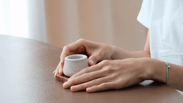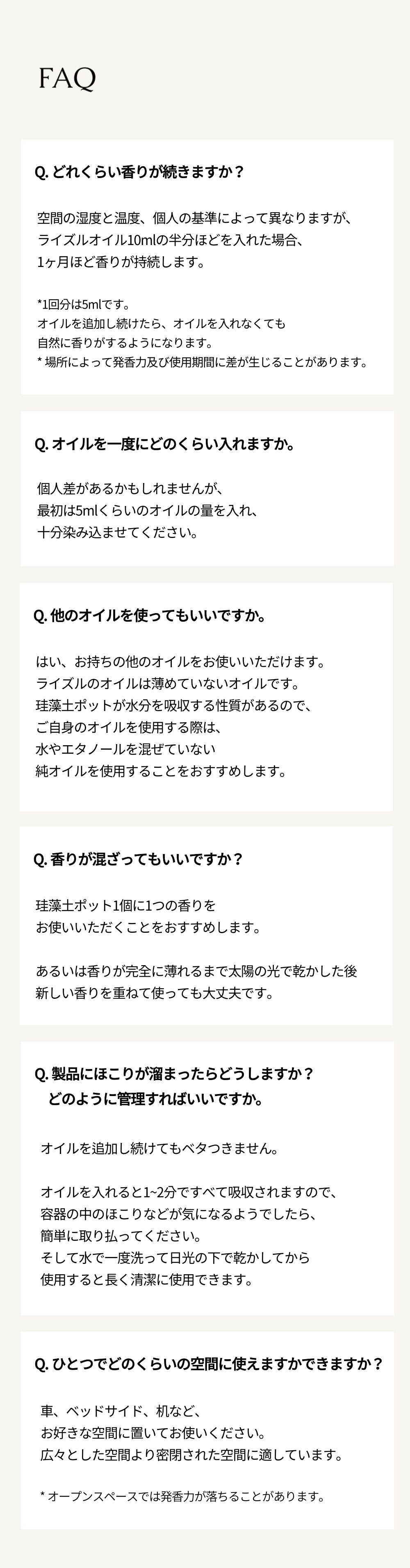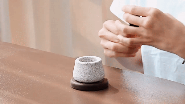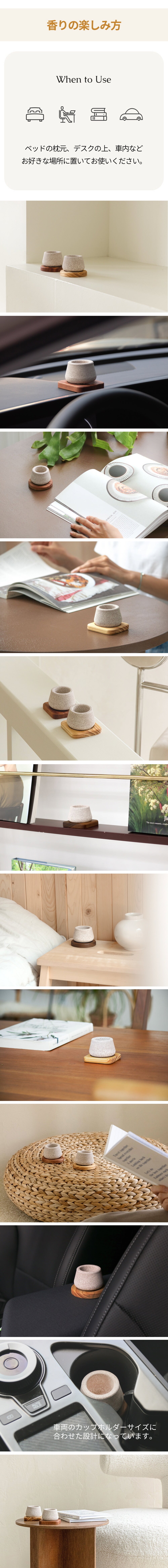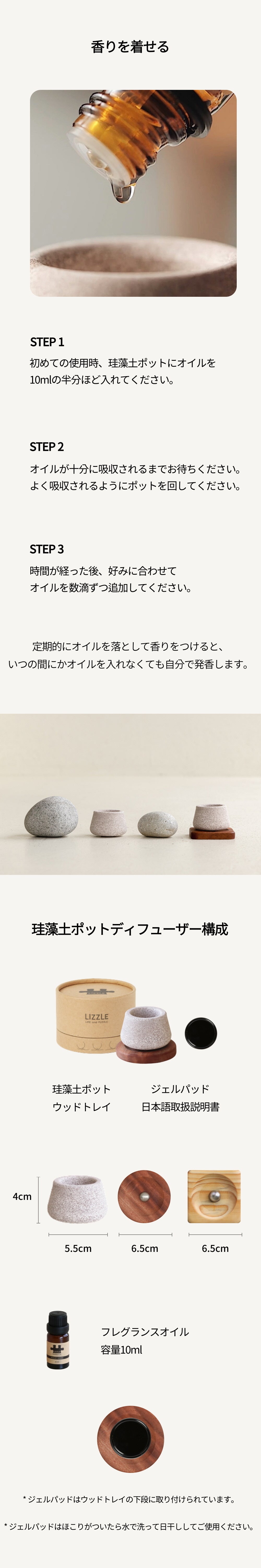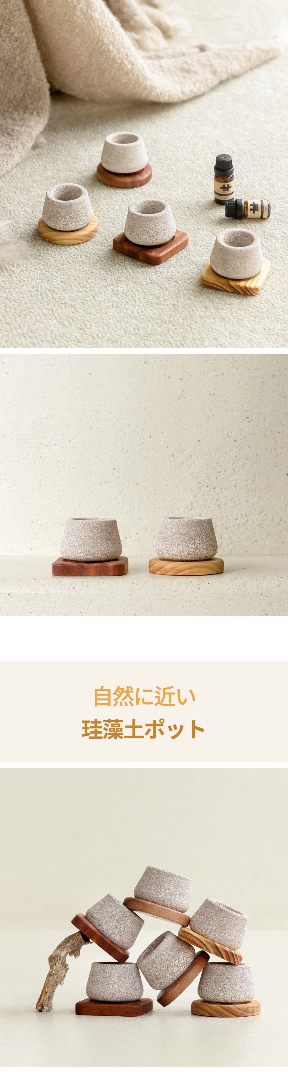 なめらかな珪藻土ポットの中に染み込んだオイルがゆっくり蒸発し、ほのかな香りを空間に広げます。