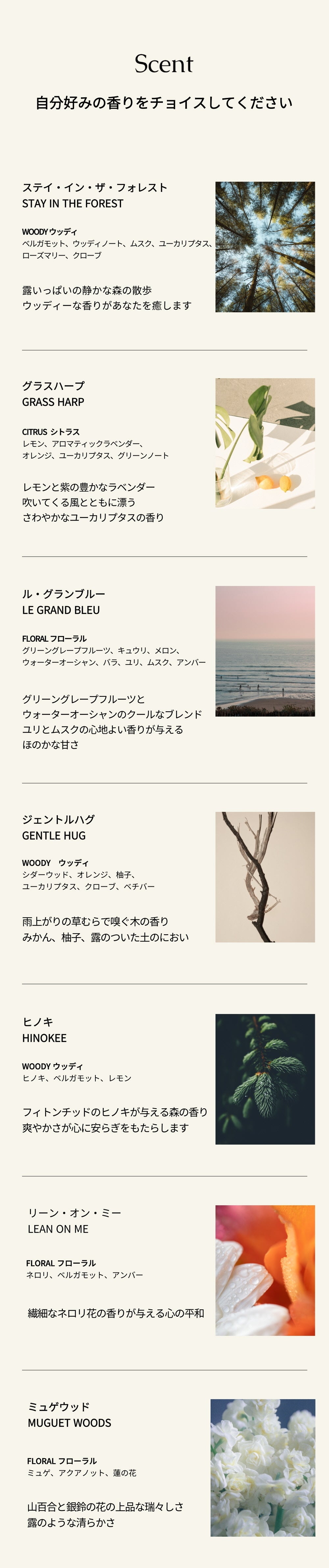 *香りが強く広がらないので、会社のデスクの上に一つ、枕元に一つ、玄関に一つ、トイレに一つ、ドレスルームに一つ置いたりして自分だけの空間を自分だけの香りで彩りましょう。