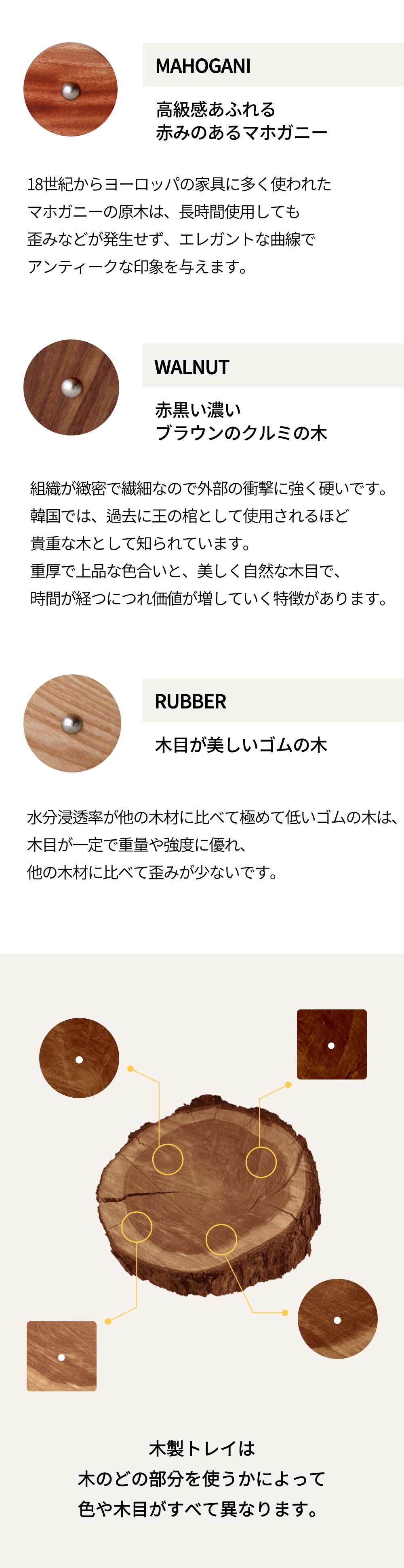 木をしっかり選別し、それぞれ異なる木目、色を生かした木製トレイで見た目の美しさにもこだわりました。