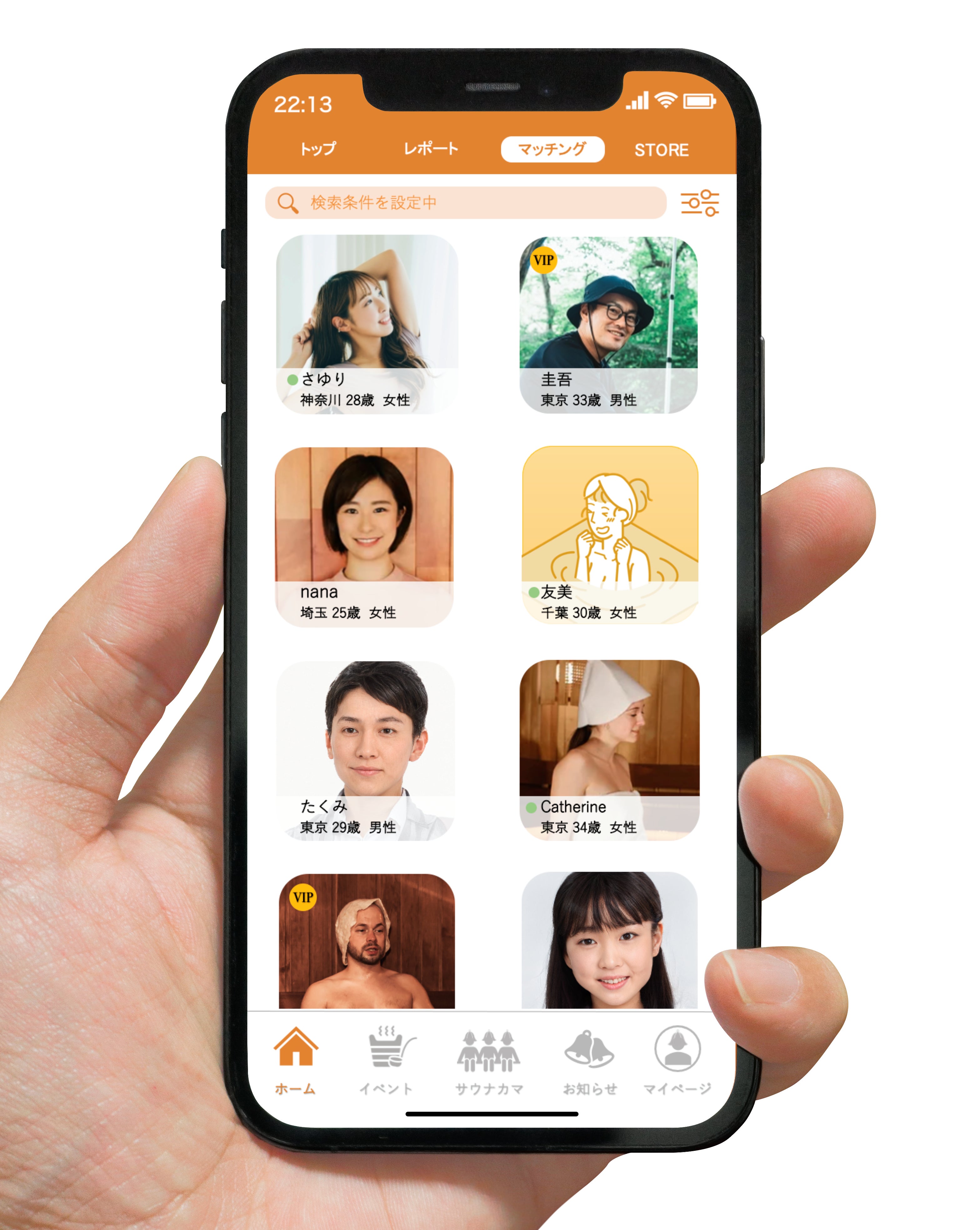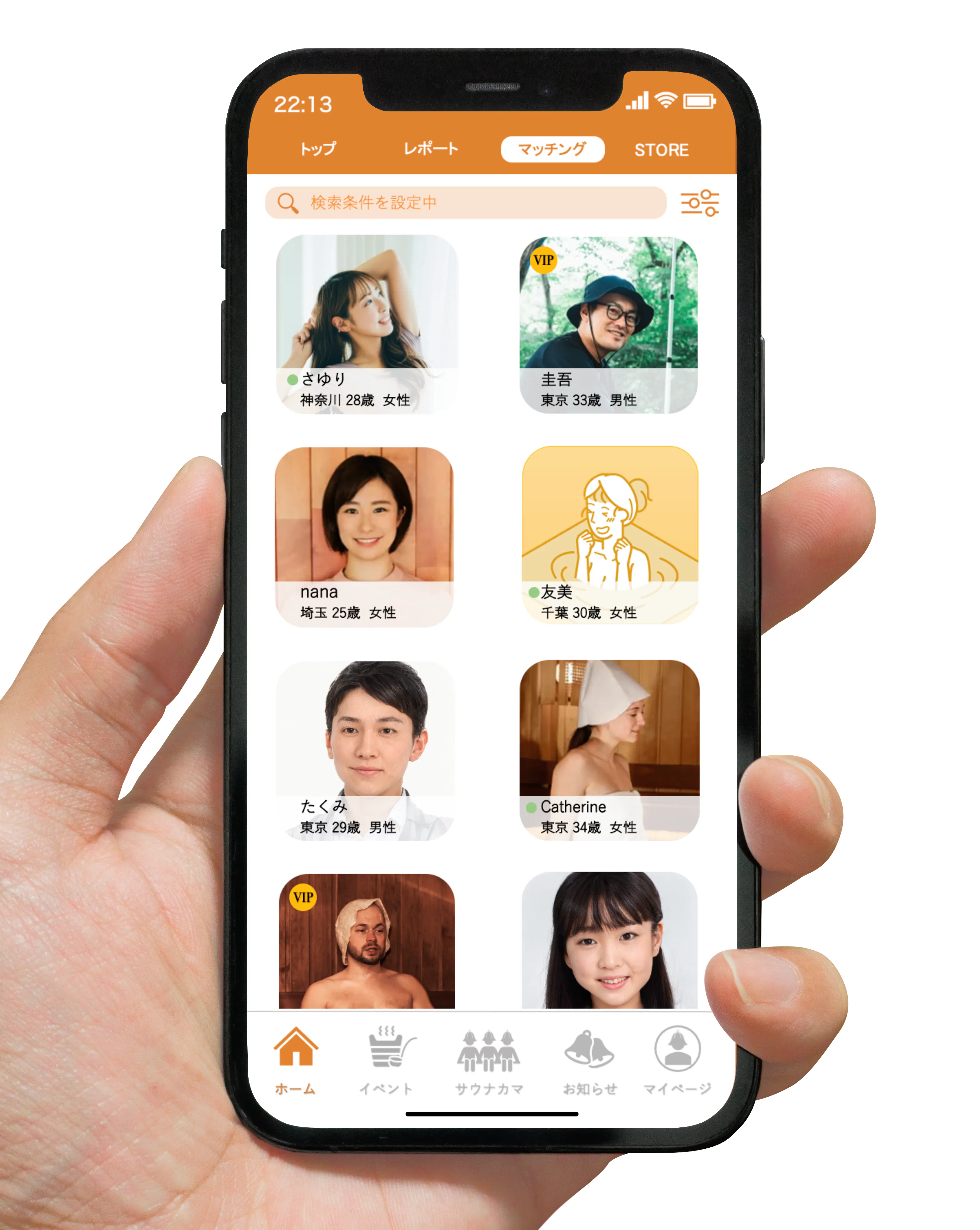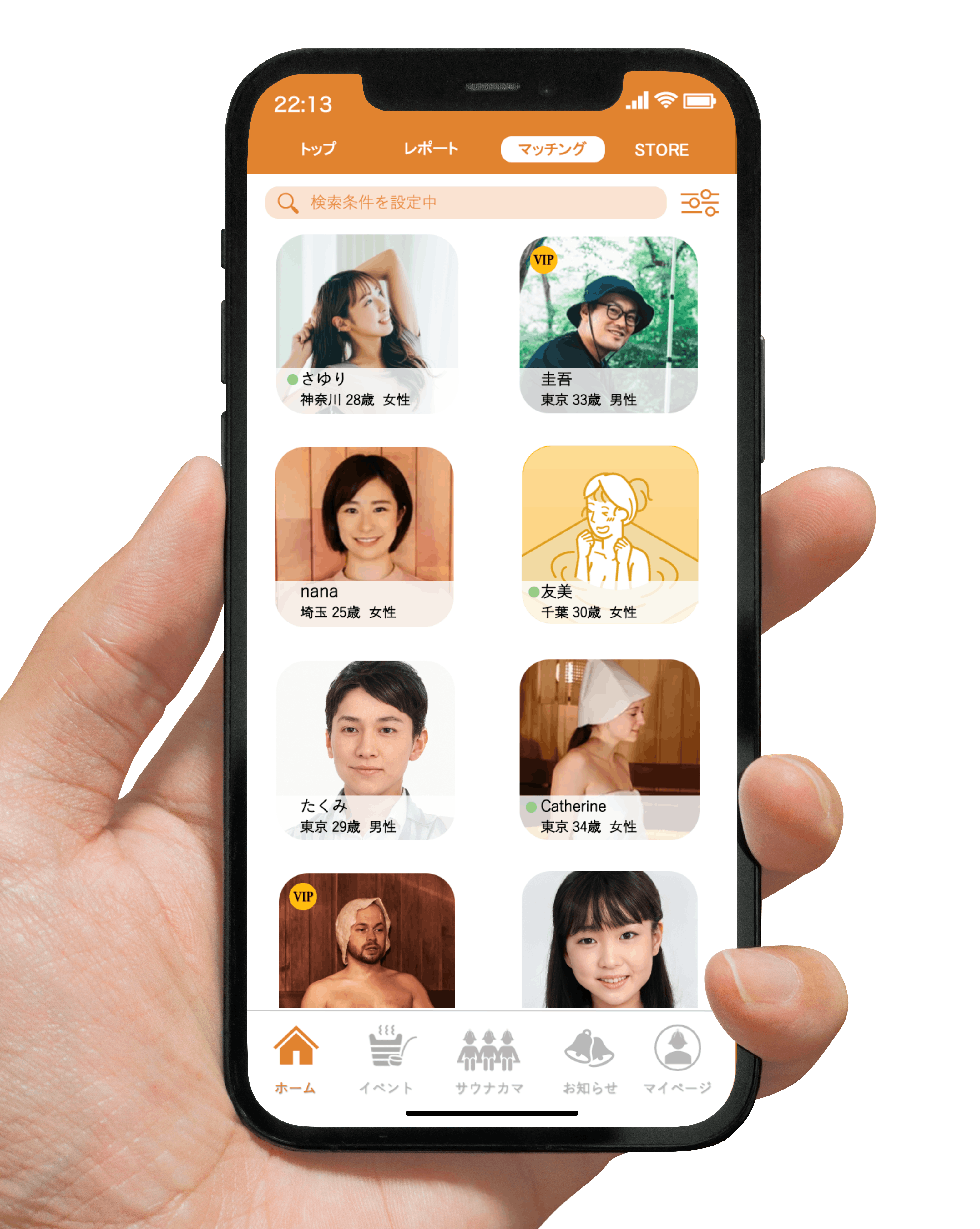 趣味仲間や女子会などはもちろん、一般的なマッチングサイトと同様に、サウナ好きのパートナーが欲しいという方もOK!自分の年齢や性別、趣味、出会いたい相手の属性を登録し、その属性が合う人とマッチングすることができます。